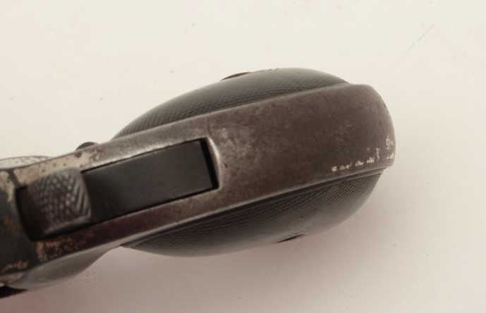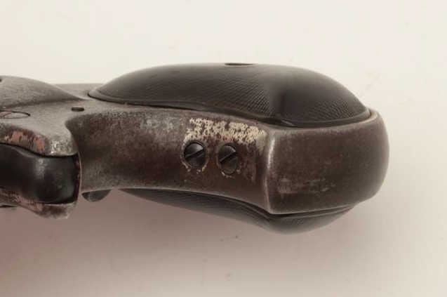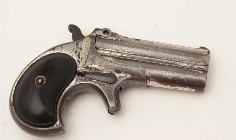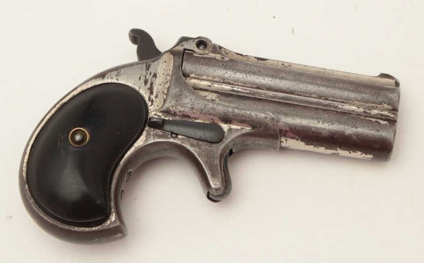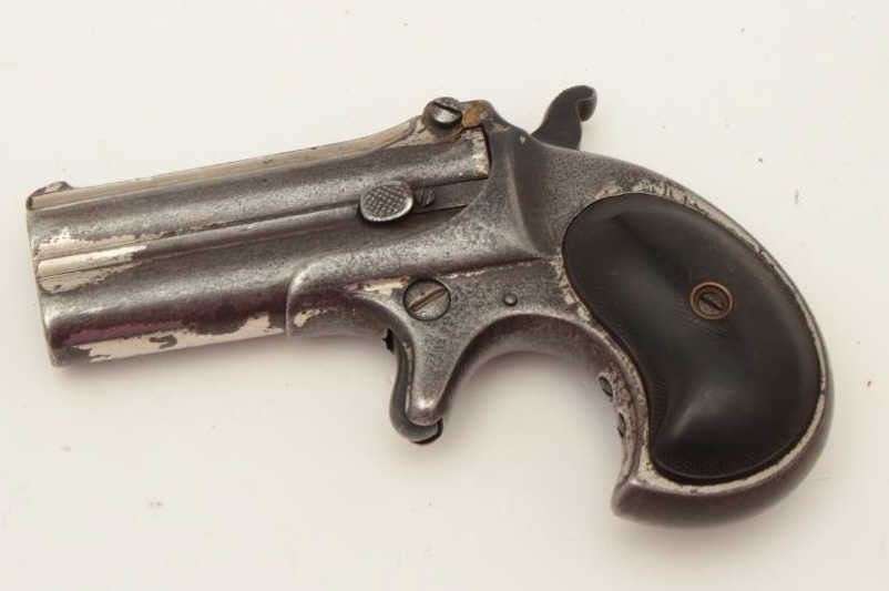 Remington O/U derringer, 2 line address, .41 caliber, S/N 88, repaired hinge, nickel finish, checkered hard rubber grips; traces of nickel finish remaining in protected areas, working action, worn but completegrips. (Antique). Est.: $250-$500.