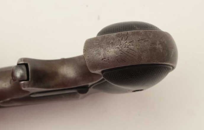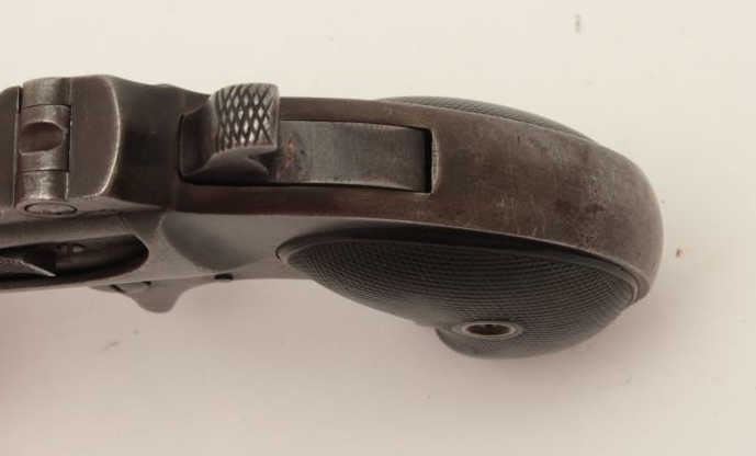 Remington O/U Type 3 derringer, .41 caliber, checkered black hard rubber grips, S/N 965, dark patina, traces of original muted blue in protected areas, grips show even wear, good action. (Antique). Est.:$250-$500.