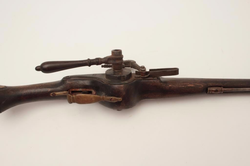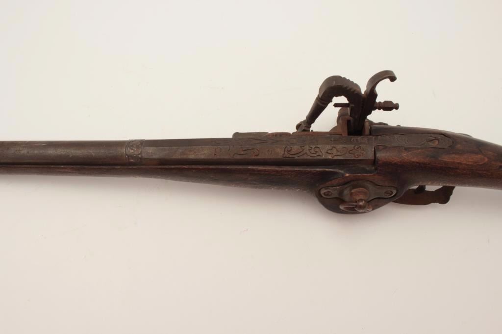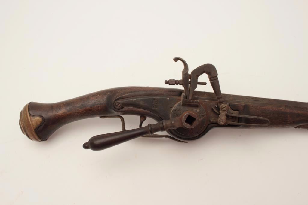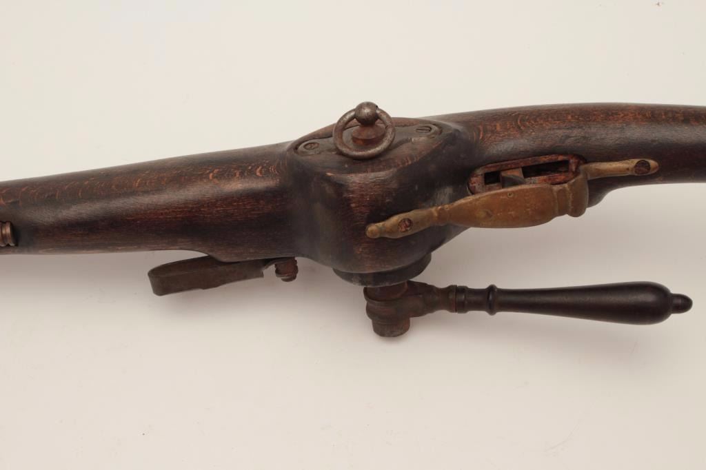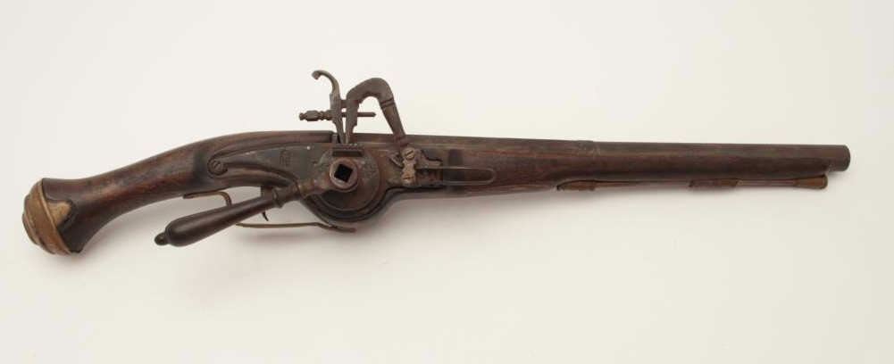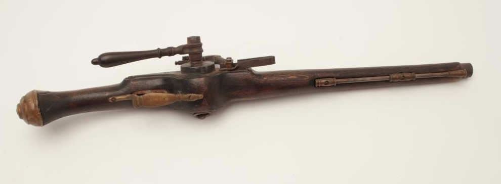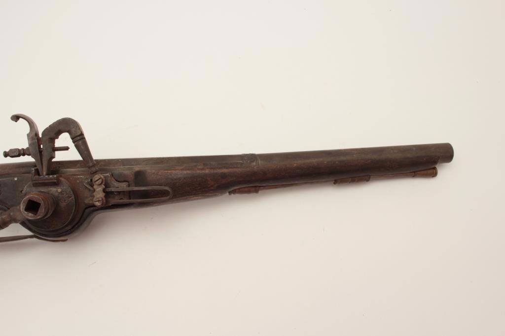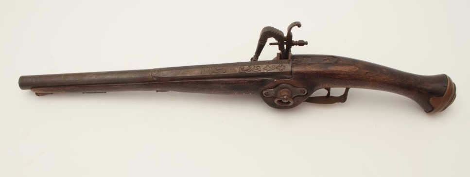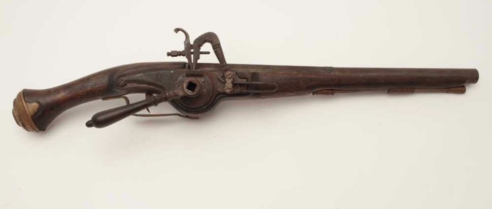 Lot 596 Reproduction Wheelock pistol, approximately 24” overall displaying a dark patina to metal surfaces