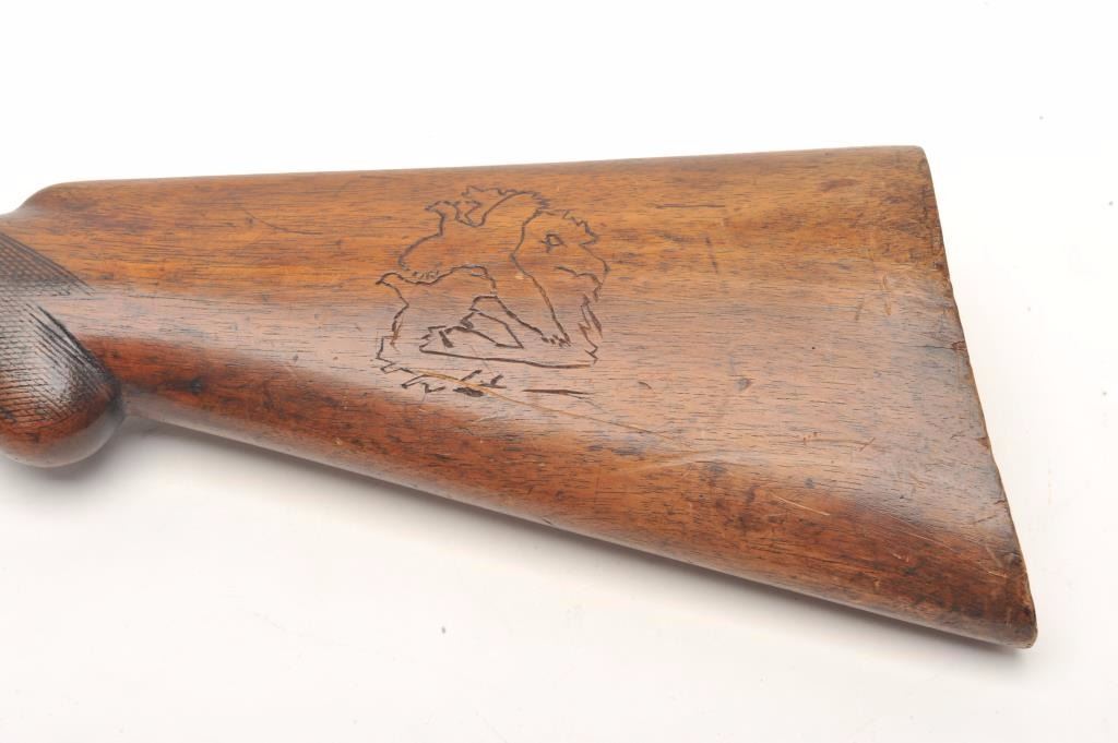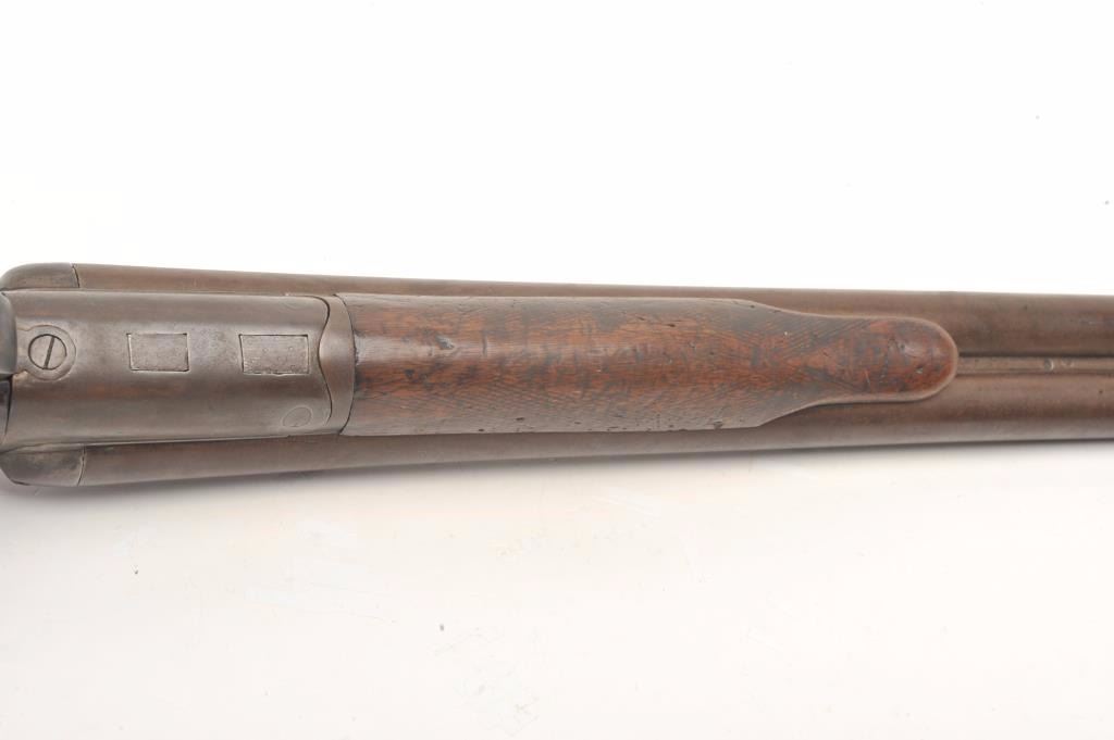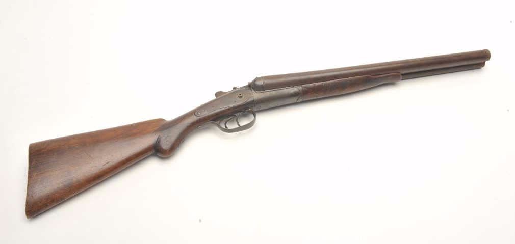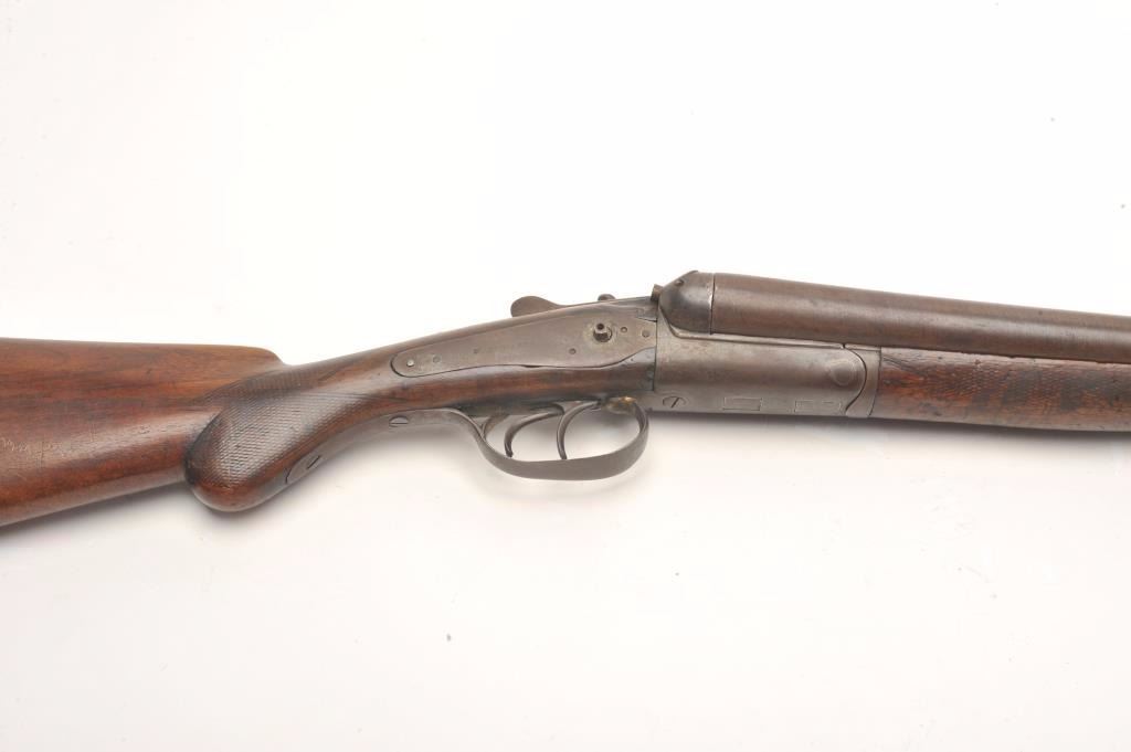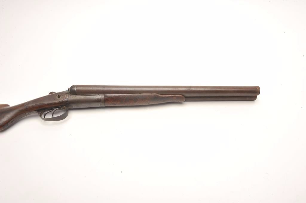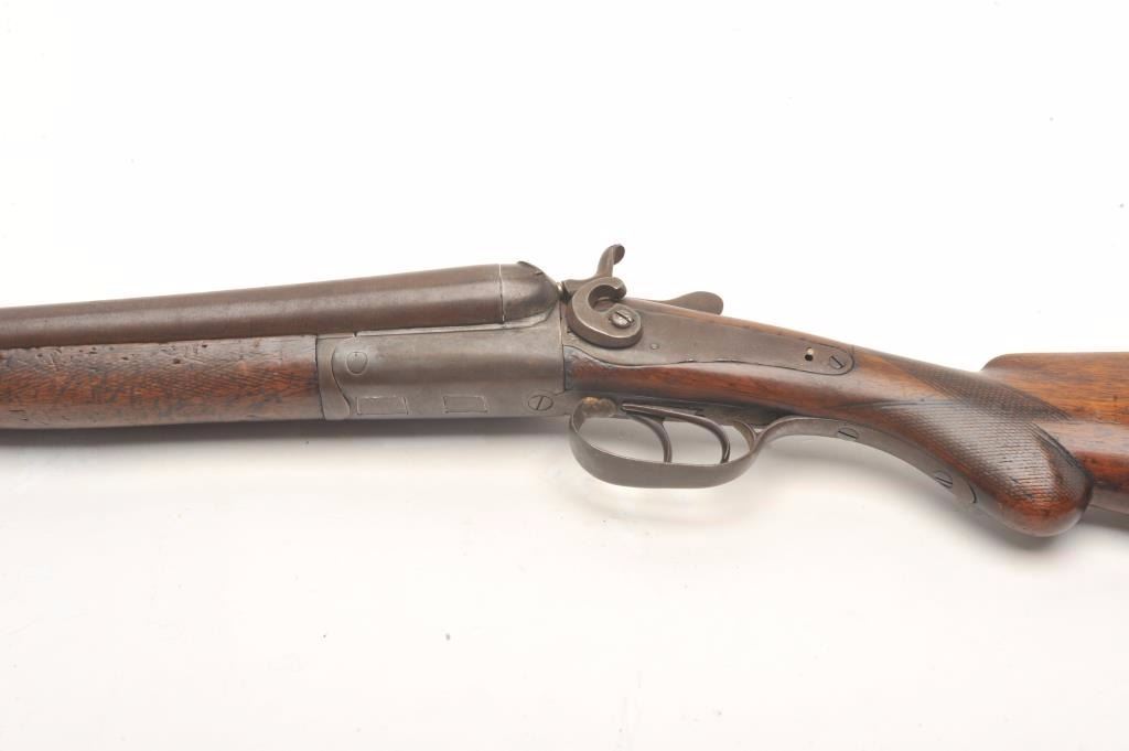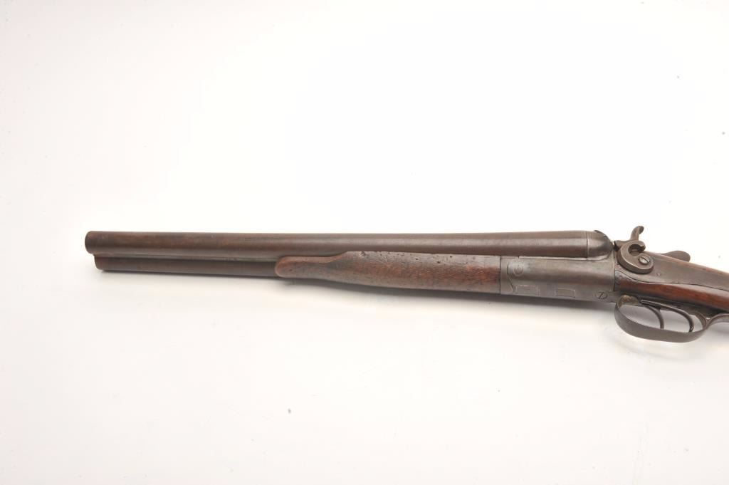 W. Richards SxS back action locks shotgun, 12 gauge, barrels cut down to coach size of 18”, checkered wood stocks, S/N 4191, dark patina, missing right side hammer, well worn stocks, rough bore; would make a nice wallhanger. (Antique). Est.: $100-$200.