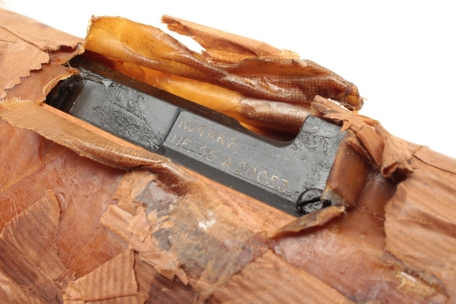 Enfield No. 4 MK 2 bolt action rifle, .303 caliber, S/N UF 55 A 20053 in cosmoline and paper wrapping with cardboard shipping box. (C&R/PPT). Est.: $250-$500.