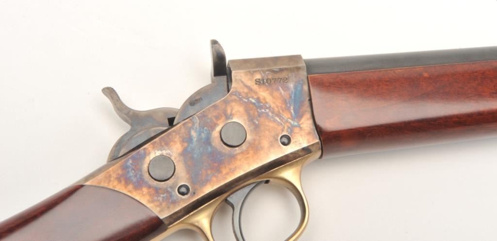 Taylor’s & Co. by Uberti small frame rolling block single shot rifle, .357 Magnum caliber, 22” round barrel, blued and case hardened finish, wood stocks, S/N S10772. This gun is in fine overall condition with the majorityof its original finish remaining, fine bore, action, markings and wood. (Modern/PPT). Est.: $250-$500.