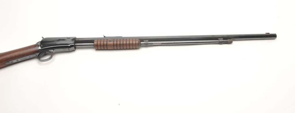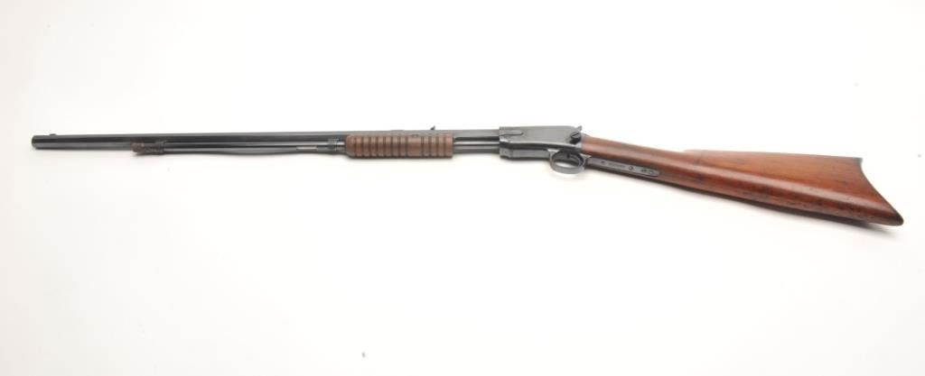 Winchester Model 1890 takedown pump rifle, .22 Short caliber, serial #392583. The rifle is in good overall condition as re-finished with a 24” octagon barrel. The barrel, magazine and receiver retain a significantamount of an old, quality re-blue with some light to moderate surface rust noted at the muzzle. The smooth wood stocks are in good condition with small mars and compressions consistent with use. The butt stock endswith a smooth crescent butt plate showing moderate surface rust from poor storage. The bore is rough and may clean, the action crisp and markings are legible. (C+R) Est.: $200-$400.