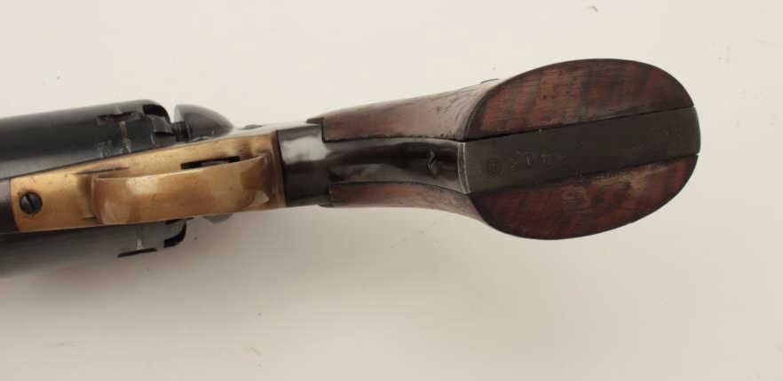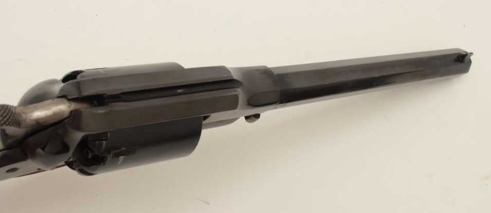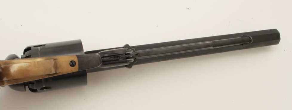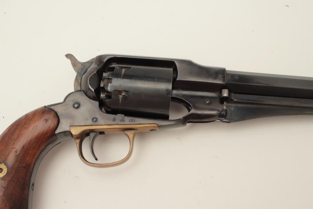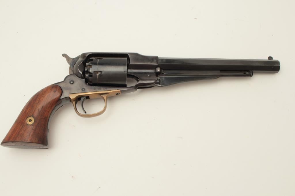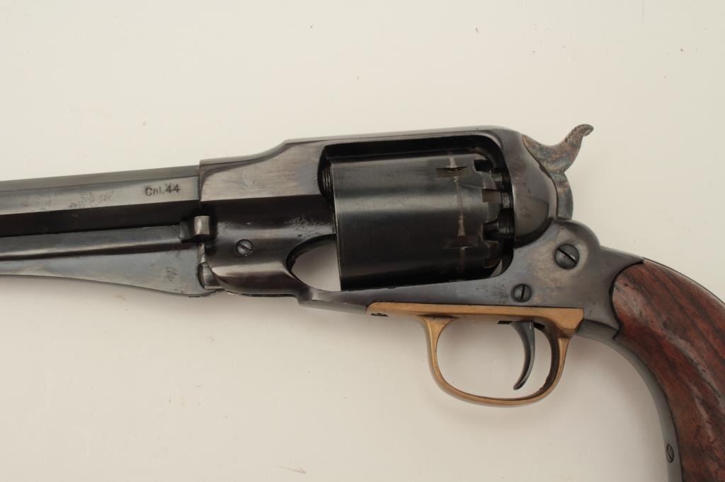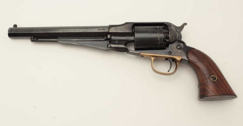 Navy Arms Co. replica of a Remington Model 1858 single action percussion revolver, .44 caliber, 8” octagon barrel, blued finish, wood grips, S/N 12168, in overall very good condition with majority of its blued finishremaining, crisp action and very good grip displaying some wear to grips finish. (Percussion). Est.: $100-$200.