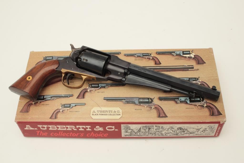 Uberti replica of a Remington Model 1858 percussion revolver, .44 caliber, 8” octagon barrel, blued finish, wood grips, S/N 87240, in fine condition showing little handling; accompanied by factory cardboard box andpaperwork. (Percussion). Est.: $100-$200.
