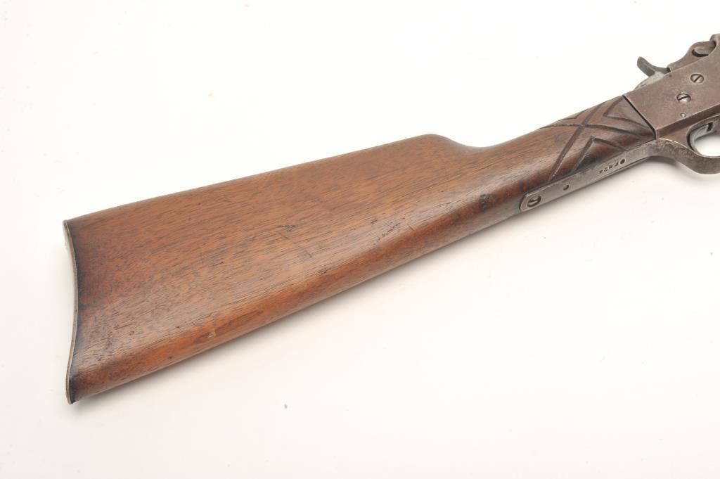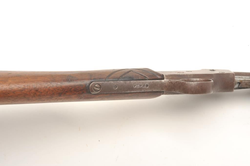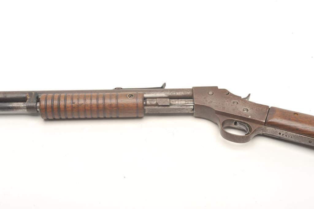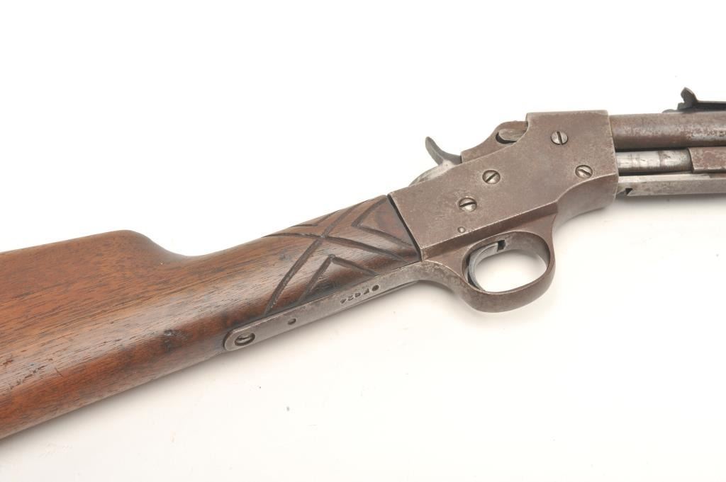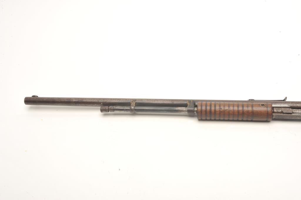 Stevens Visible Loader pump rifle, .22 Short, Long or Long Rifle caliber, serial #OFQ24. The rifle is in fair overall condition with a 22” barrel. The barrel, magazine and receiver have gone entirely to brown patinawith light to moderate surface rust and significant welding done to re-attach the magazine tube. The smooth wood stocks are in fair condition showing heavy wear and use with crude hand checkering on one side of the wrist. The butt stock ends with a smooth metal butt plate that is proud at the toe. The bore is rough but may clean, the action functions and the markings are legible. (C+R) Est.: $100-$200.