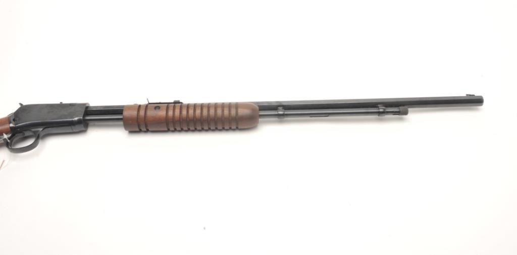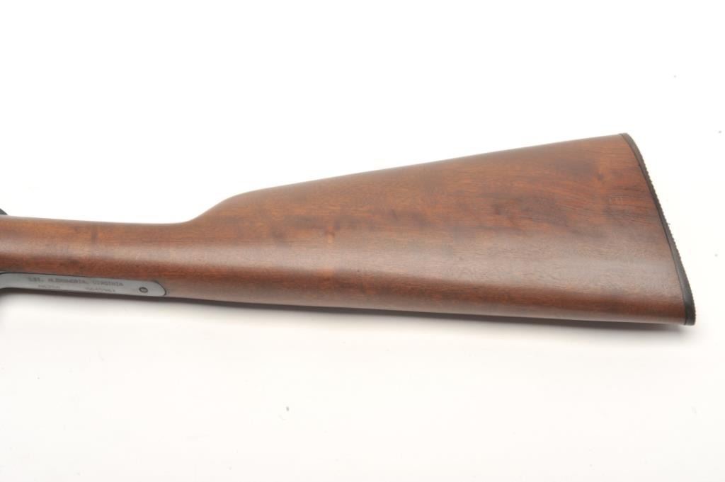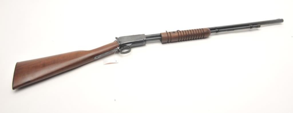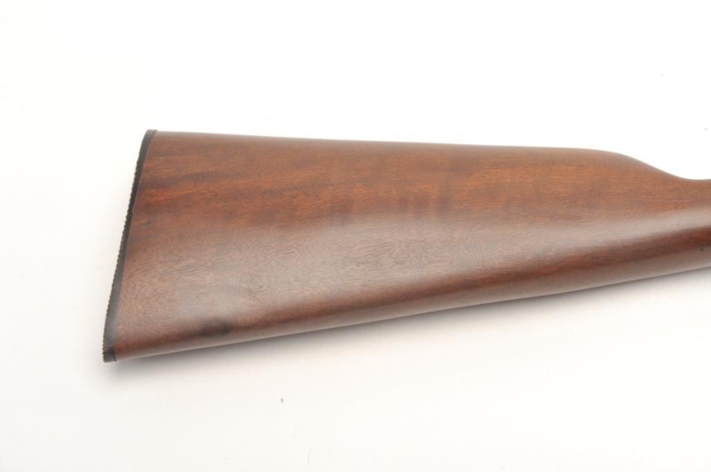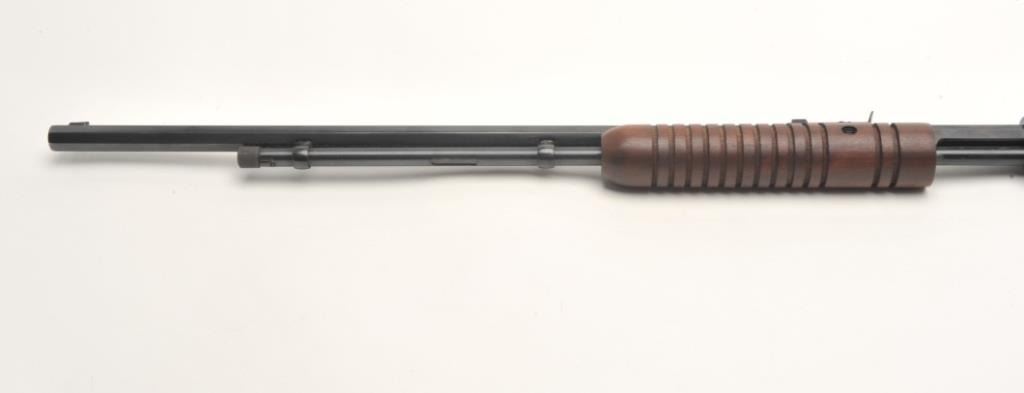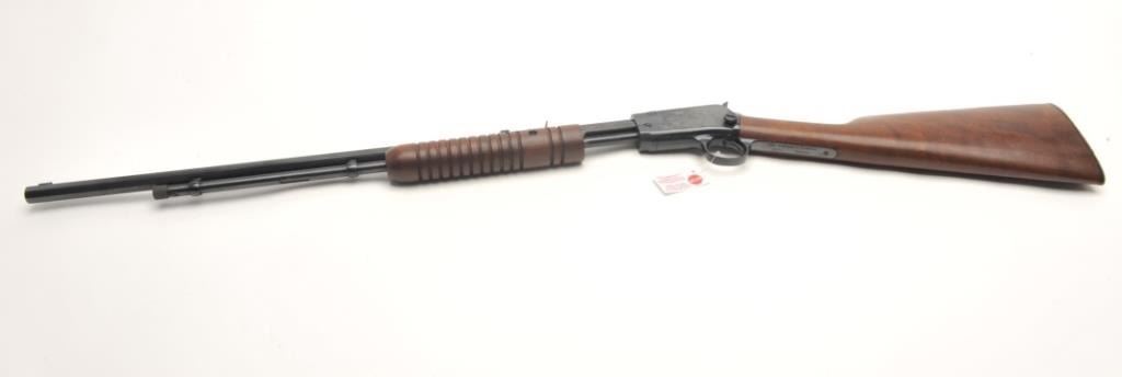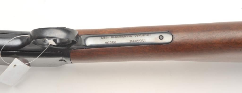 Rossi Model 62 takedown pump rifle, .22 L.R. caliber, serial #G645961. The rifle is in very good overall condition with a 23” octagon barrel with a blade front and standard rear sights. The barrel, ¾ magazine and receiver retain nearly all of their blued finish with only light handling marks noted. The smooth wood stocks are in very good condition with small mars and some finish loss on the butt stock. The buttstock ends with a plastic, Rossi marked butt plate. The bore is good, the action crisp and markings are sharp on this lightly used rifle. (Modern) Est.: $90-$180.