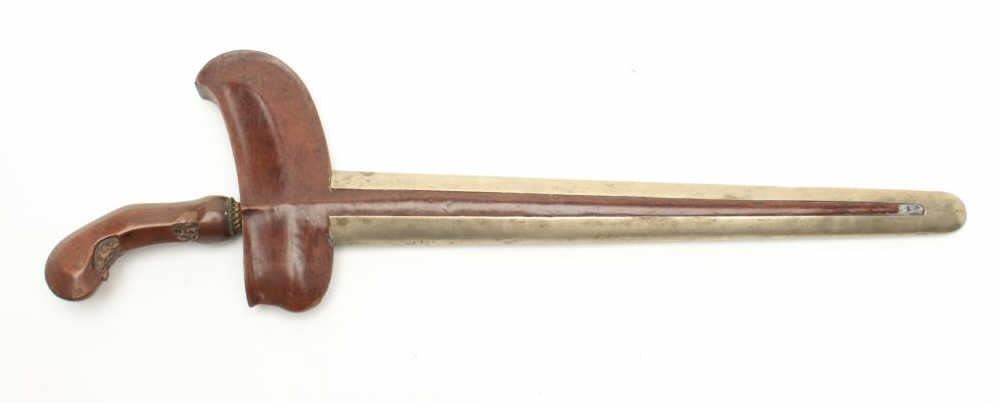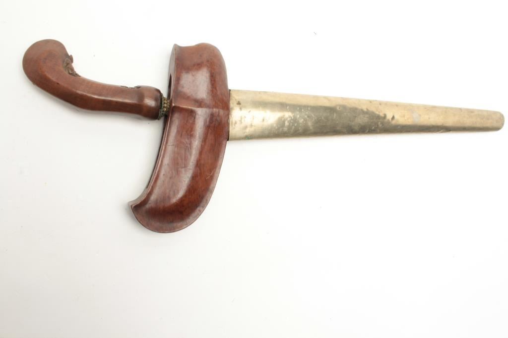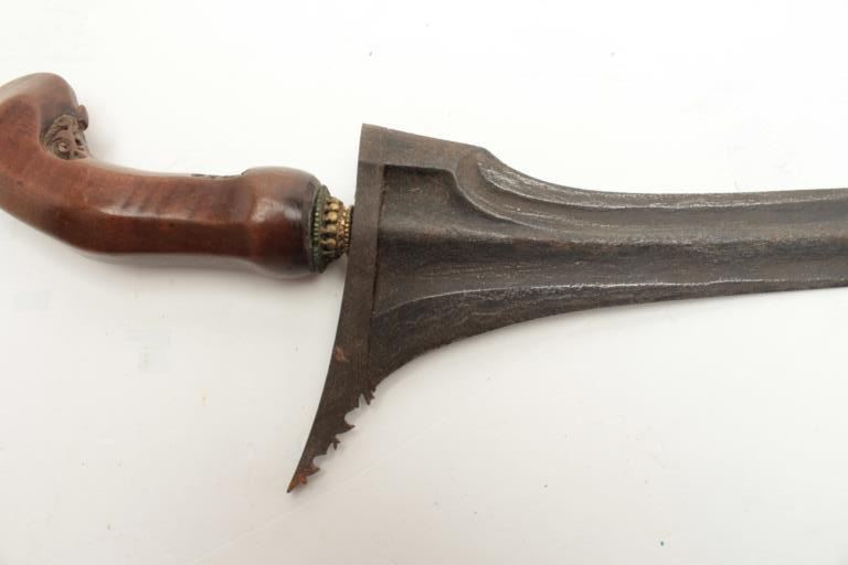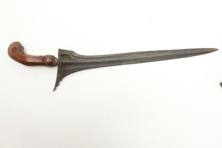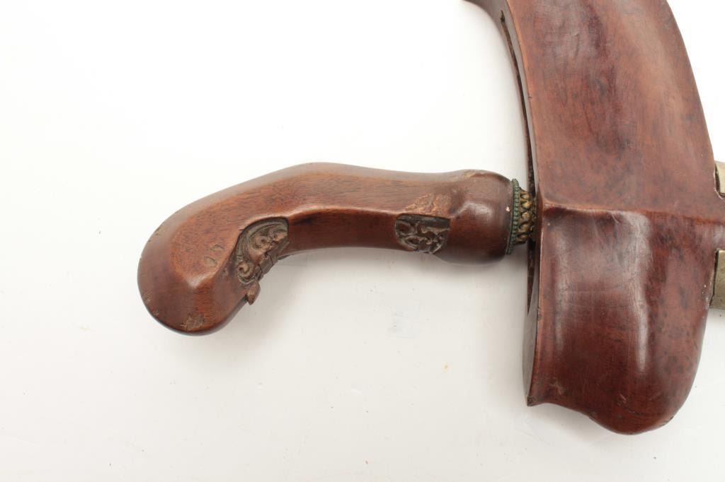 Beautiful Malaysian Kris with carved exotic wood and hammered brass scabbard. The Kris measures 18” total length with a 14” hand forged straight blade. The blade shows no sharpening while the ornately carved woodhandle is in very good condition with only small flea bite chips. The carved wood and hammered brass scabbard is in good condition with small mars and dents, the brass toning to a pleasing color. Est.: $100-$200.