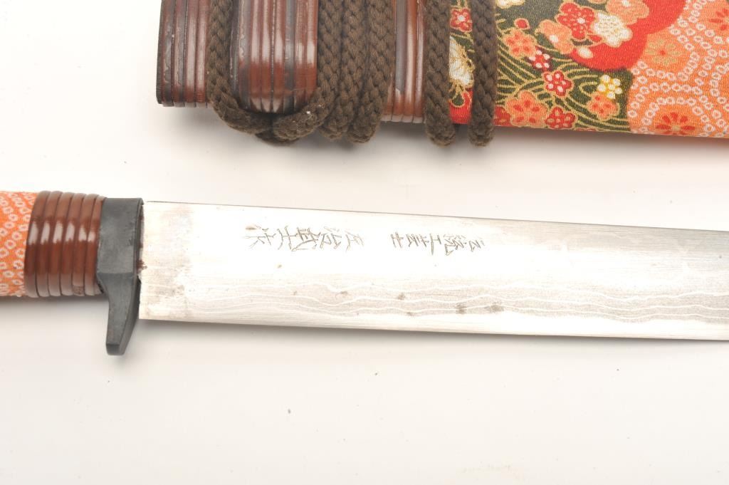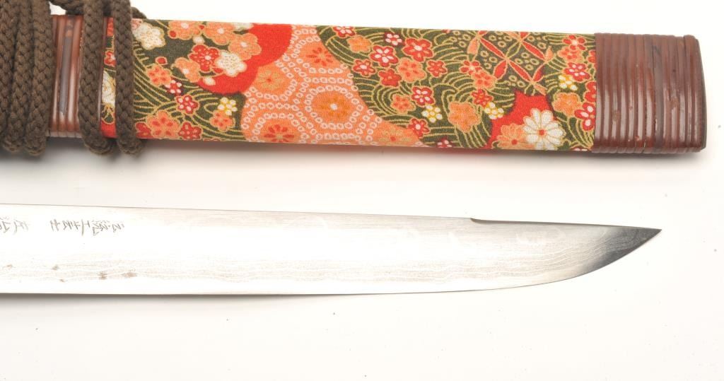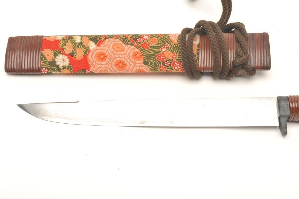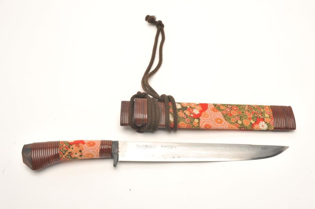 Traditional and high quality Japanese bonsai knife with signed and damascened blade. Measures 16 ¾” overall with an 11 ¼” blade. In very good plus condition from late 20th century. Est.: $100-$200