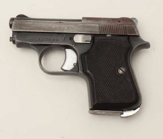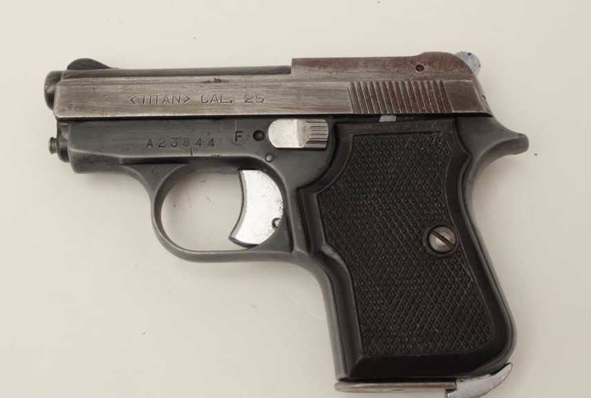 Titan Model pocket semi-automatic pistol by F.I.E. corp., .25 caliber, 2.5” barrel, blued finish, checkered grips, S/N A23844, in overall fair to good condition showing some blue mixed with grey patina, good action,good markings, good bore and good grips. (Modern/PPT). Est.: $50-$100.