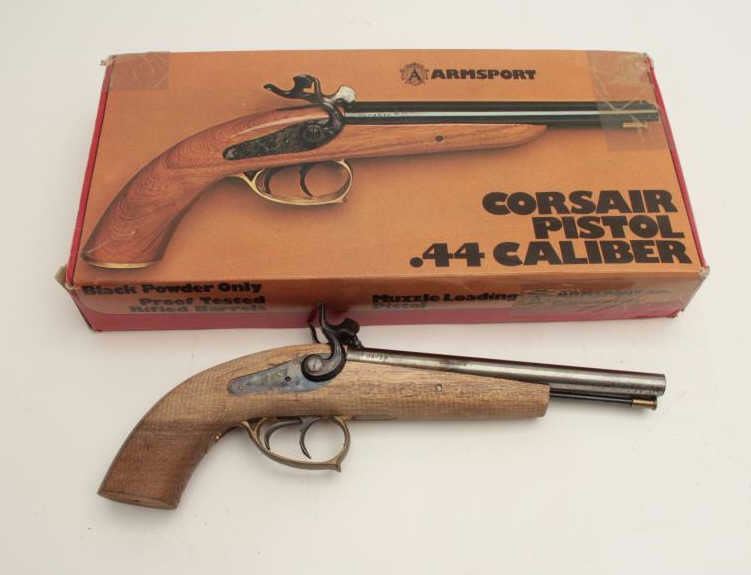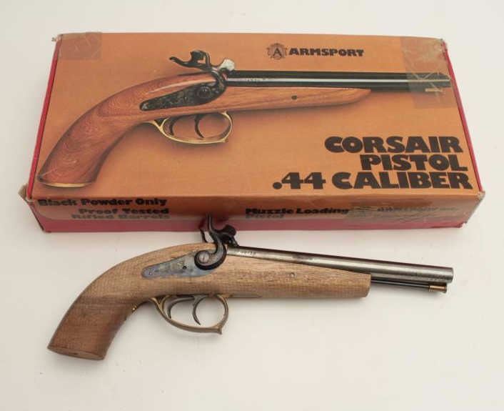 Armsport SxS blackpowder percussion pistol, .44 caliber, double triggers, wood stock, S/N 05939, project gun to finish; good actions; in factory cardboard box. (Percussion). Est.: $50-$100.