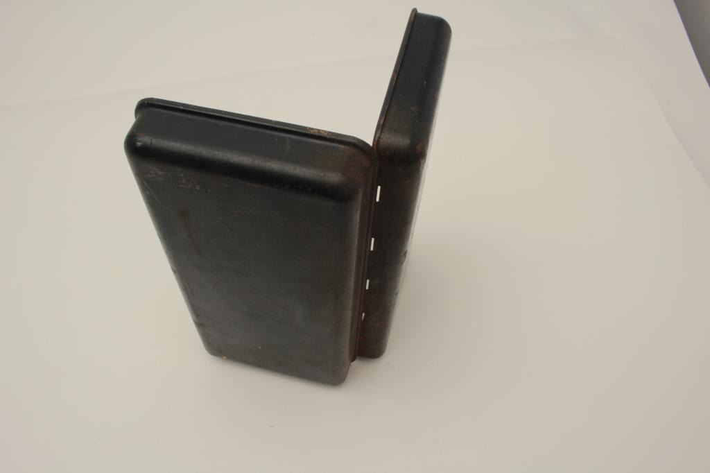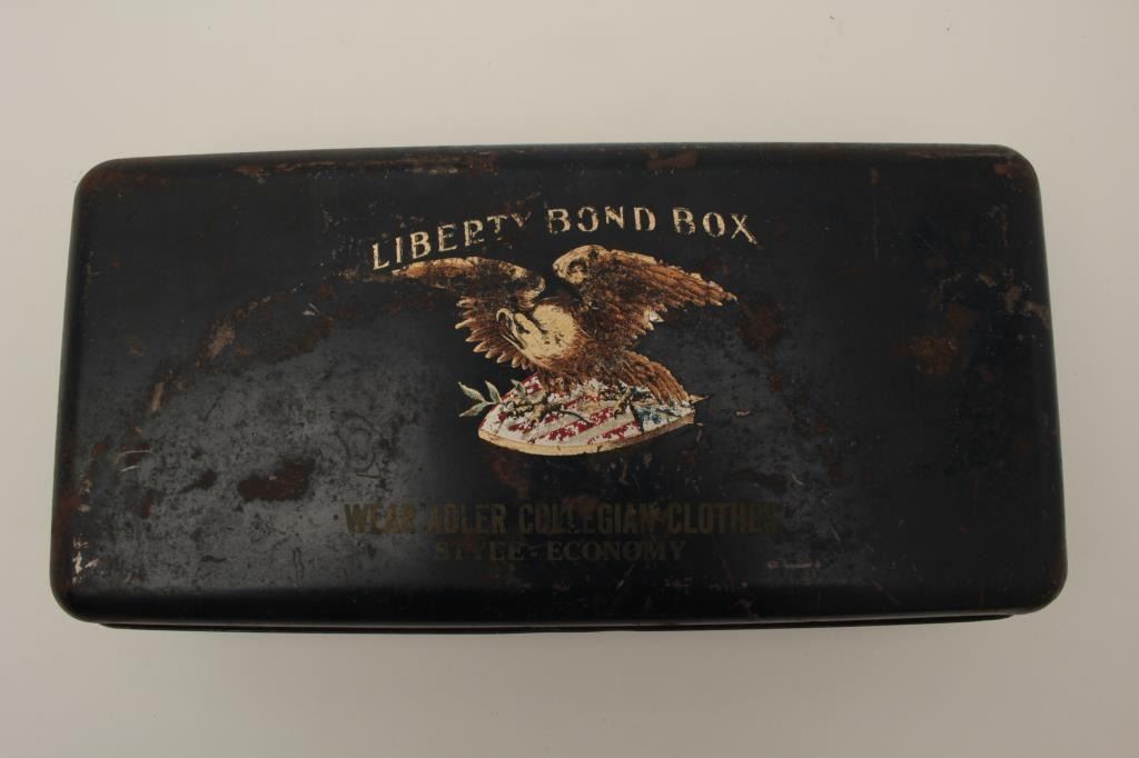 WW I metal Bond box, approximately 11” x 6” x3” and marked “LIBERTY BOND BOX/WEAR ADLER COLLEGIAN CLOTHES/STYLE-ECONOMY” with American Eagle. Est.: $25-$50.