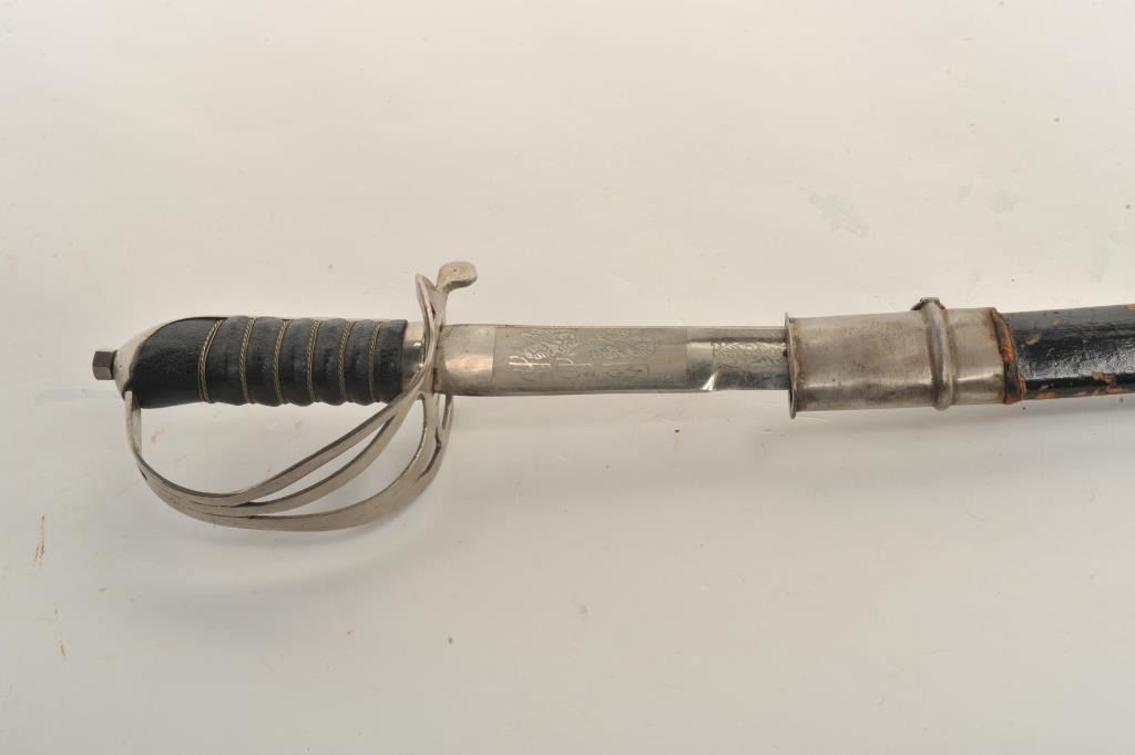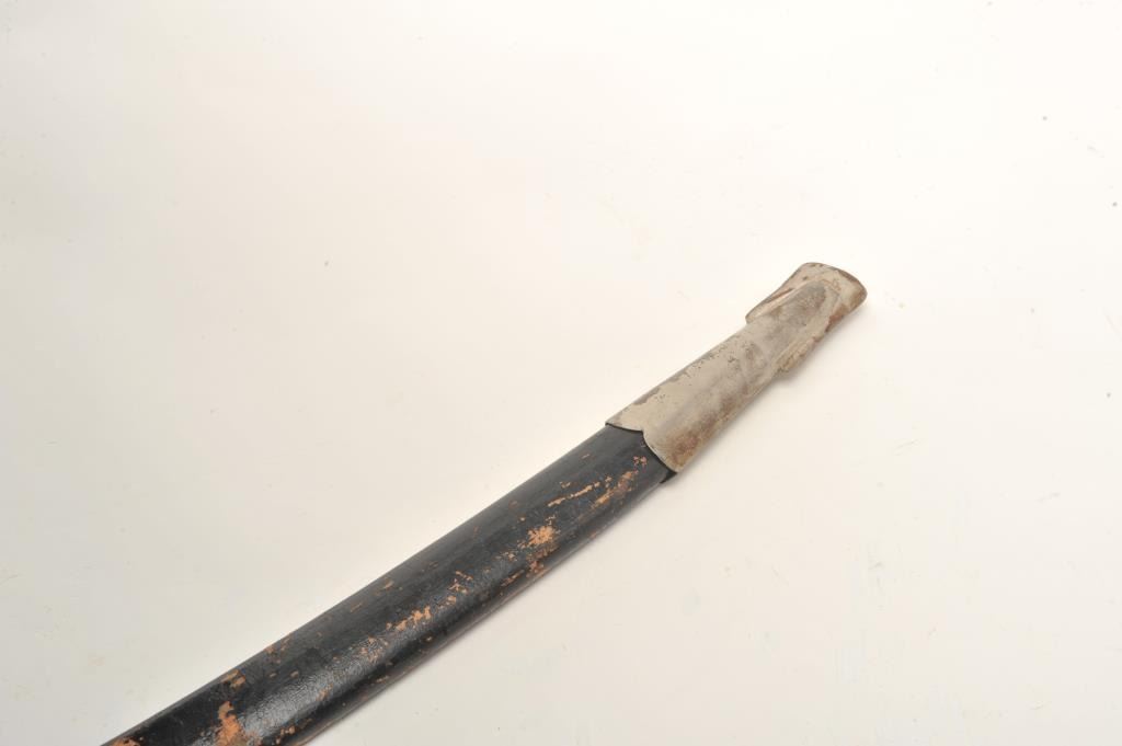 Lot 676 Indian sword and leather scabbard with metal throat and drag, approximately 38” overall. Est.: