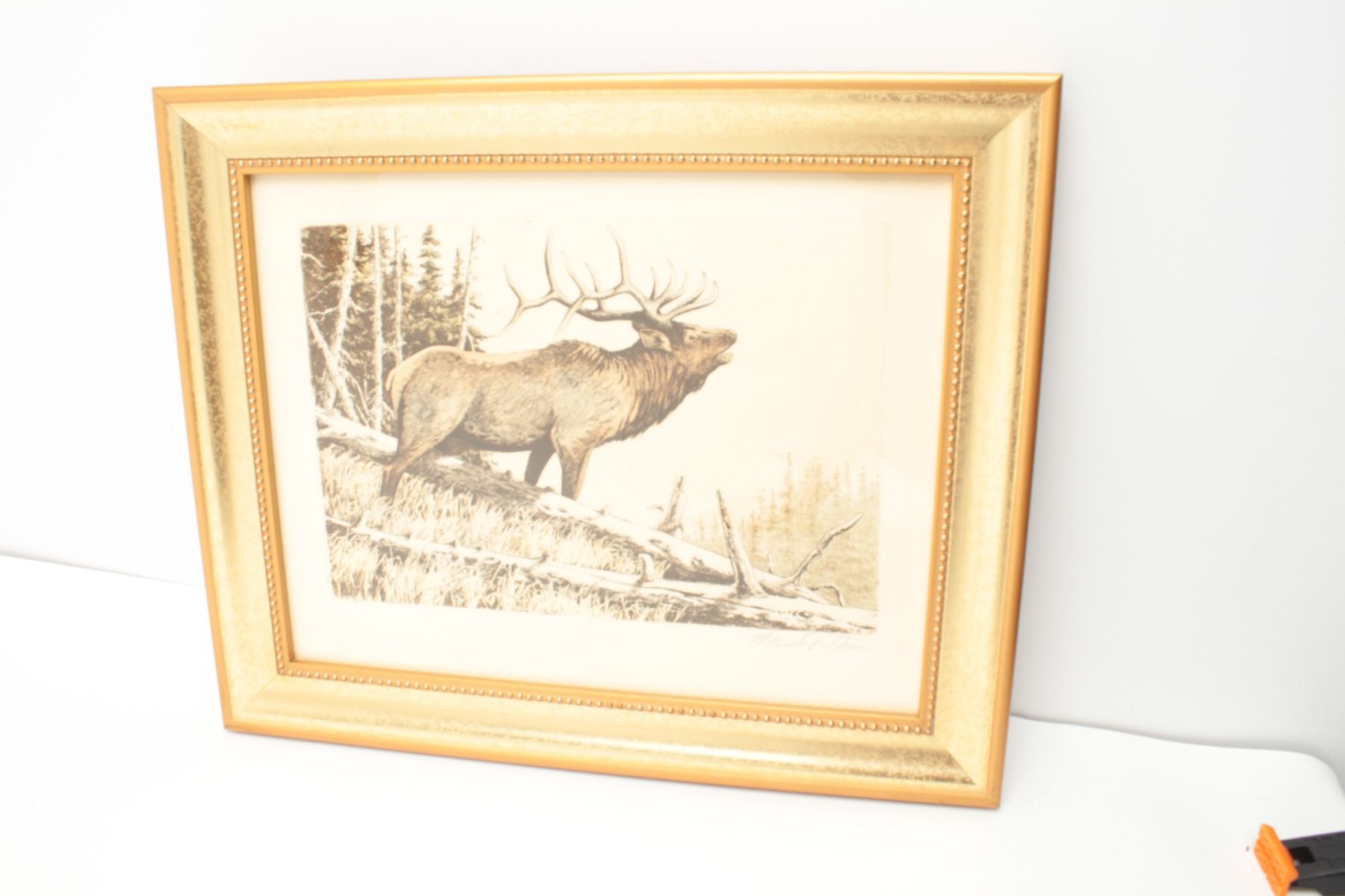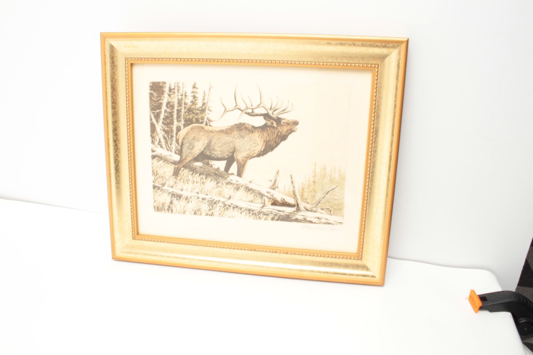 “September Song Elk”, framed and hand signed etching on rag paper by noted wildlife artist, Mike Stidham. A beautiful depiction of a bugling elk, 14” x 17” with the frame. Est.: $100-$200.