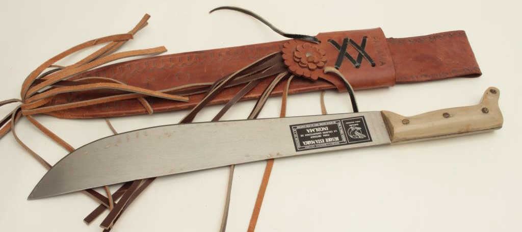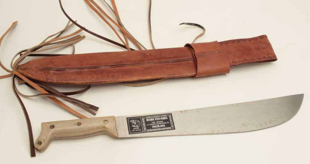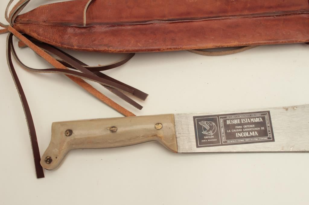 Columbian machete with bone grip and leather sheath; overall good condition. Est.: $20-$40.