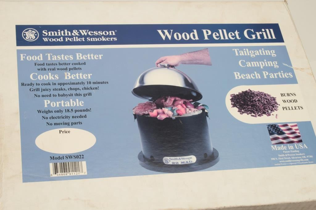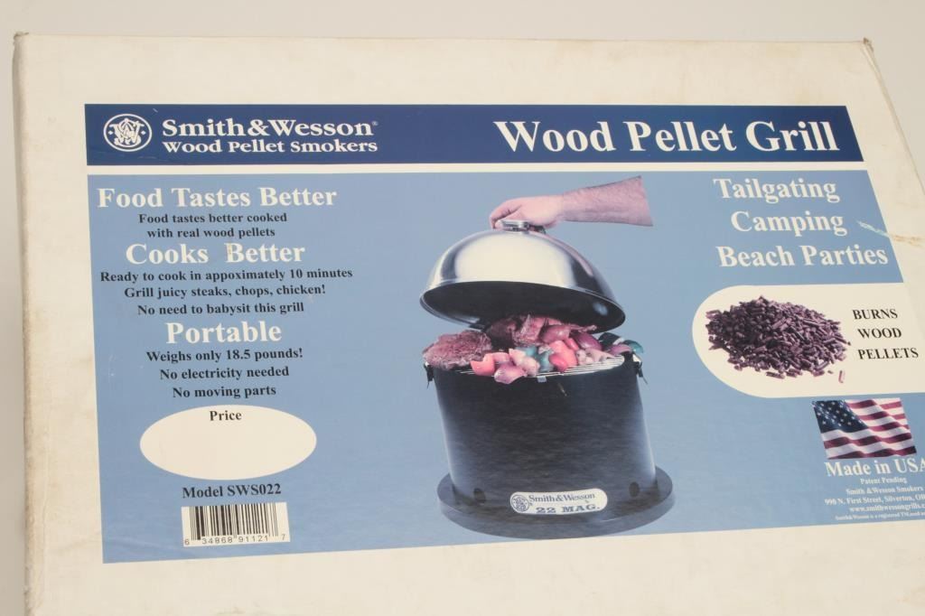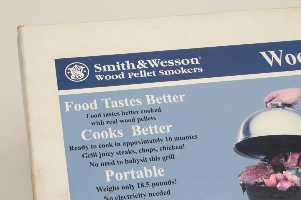 Smith & Wesson Model SWS022 wood pellet smoker, like new in factory box. Est.: $25-$50.
