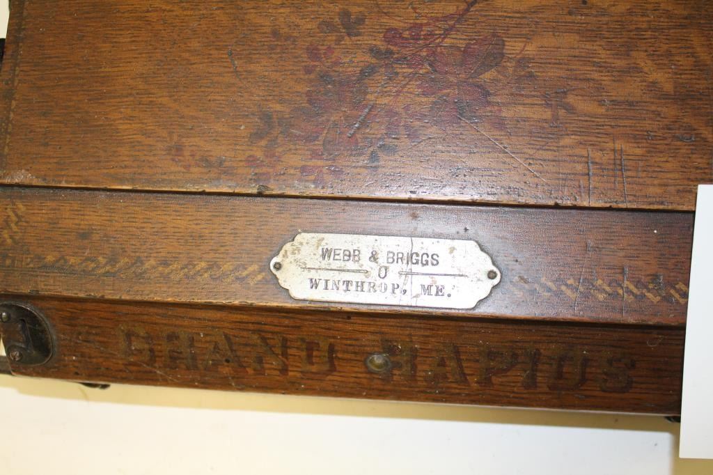 Antique wood and iron mounted floor sweeper marked “BISSELL’S/GRAND RAPIDS” with metal plate “WEBB & BRIGGS/WINTHROP, ME”, in overall good condition for its age (ca. early 1900’s). Est.: $50-$100.