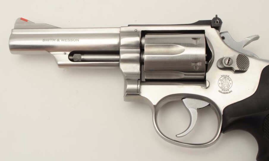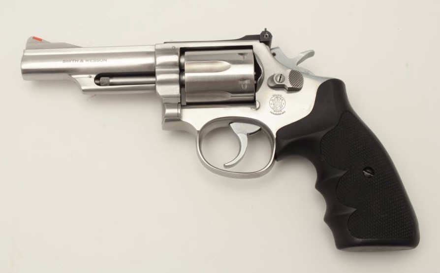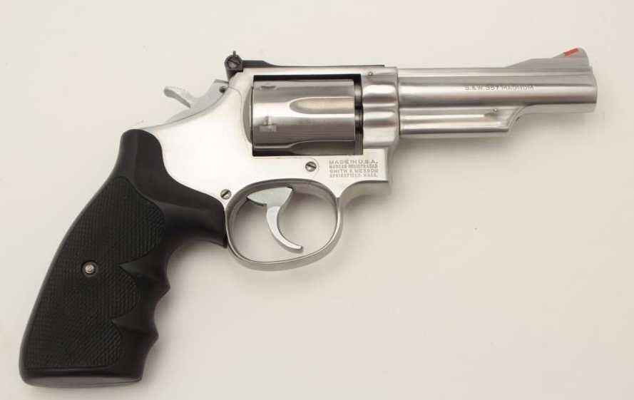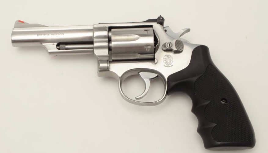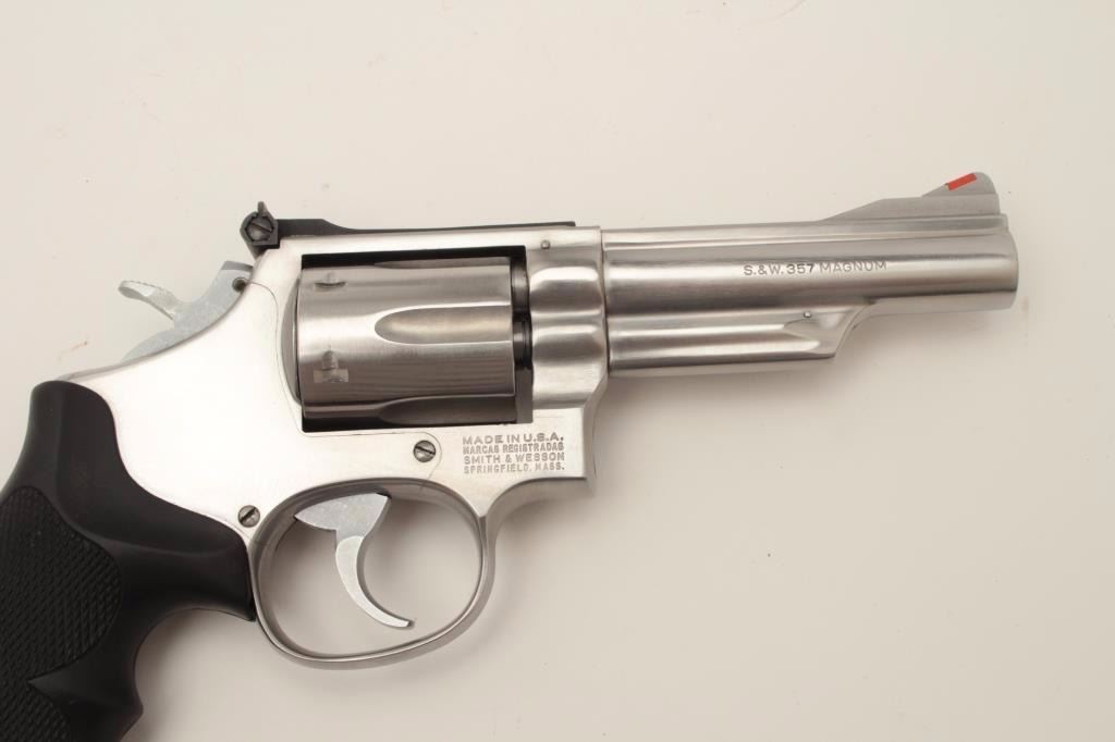 Smith & Wesson Model 66-1 DA revolver, .357 Magnum caliber, 4” barrel, stainless steel, checkered hard rubber finger groove grips, S/N 74K0831, in overall fine to excellent condition with fine bore, crisp action, sharp markings and fine grips. (Modern/PPT). Est.: $400-$800.