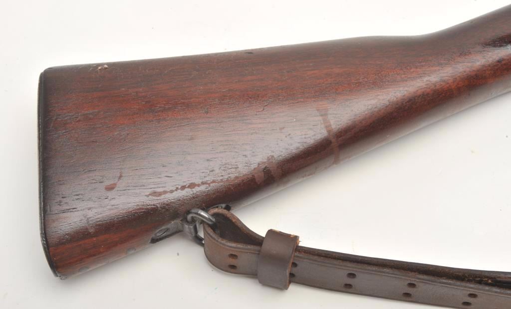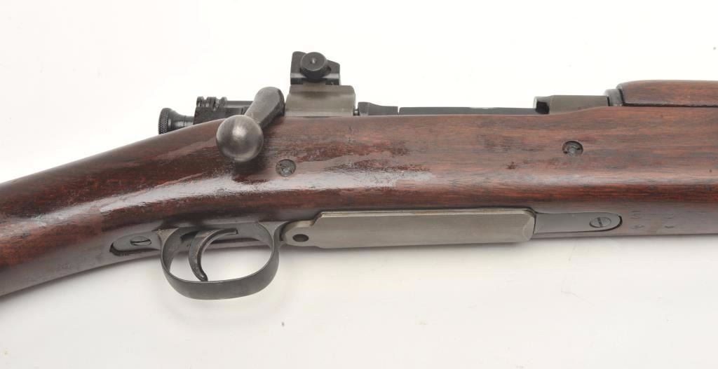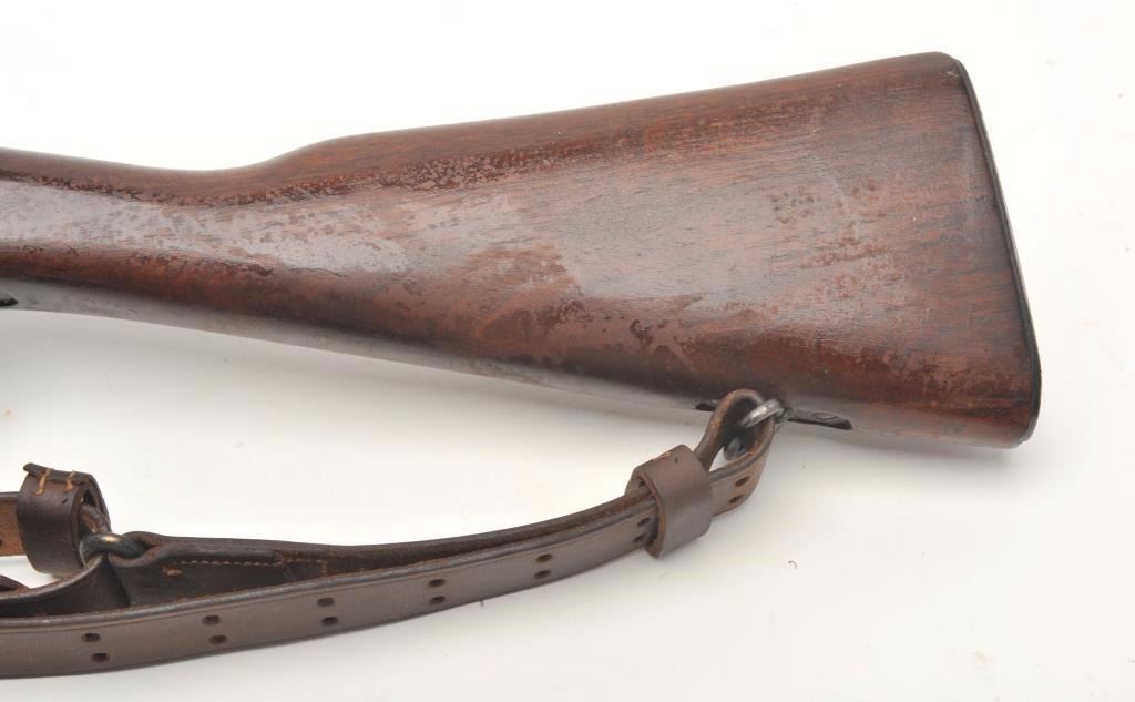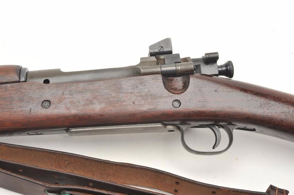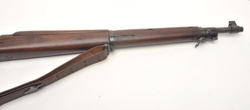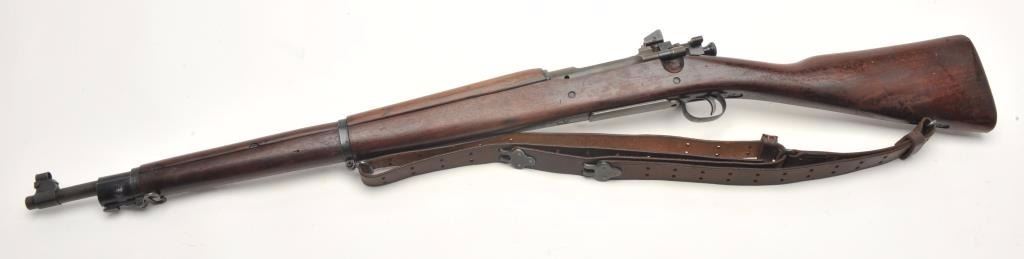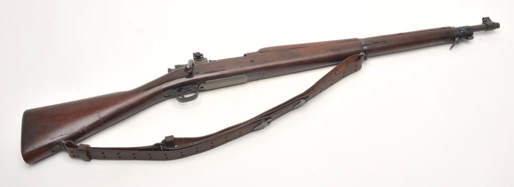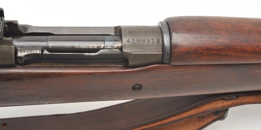 Remington U.S. Model 1903 A3 bolt action rifle, .30 caliber, serial #4199313. The rifle is in very good overall condition with a 24” barrel with a hooded front and military aperture style rear sights. The barrel andreceiver retain the majority of their military finish with significant residual packing grease evident. The Remington marked barrel is dated 11-43 with the flaming bomb emblem. The smooth wood stock is showsstorage marks, cartouches on the underside of the butt stock and an extra coat of varnish added. The stock includes sling swivels and ends with a checkered steel butt plate with trap. The bore is good, the action is crispand markings are sharp. The lot includes a leather military style sling. (C+R) Est.: $300-$600.