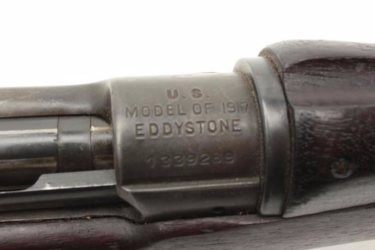 U.S. Model of 1917 Eddystone bolt action rifle, .30 caliber, serial #1339269. The rifle is in good overall condition with a 26” barrel. The barrel and receiver retain the majority of their military finish showingmoderate wear with light surface rust at the muzzle and on the bayonet lug. The barrel is dated 10-17 and marked with the flaming bomb emblem. The flaming bomb emblem is also noted on the action and the bolt handle. The smooth wood stock is in good condition with moderate wear and cartouches on the left side of the receiver and behind the trigger guard. The stock includes sling swivels and ends with a smooth metal butt plate withtrap. The bore is good, the action crisp and markings are sharp. (C+R) Est.: $350-$700.