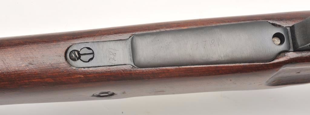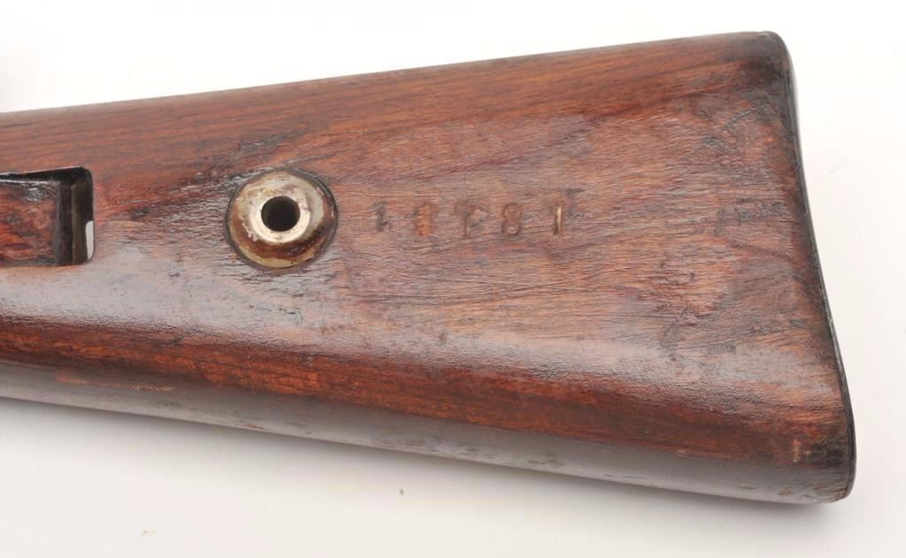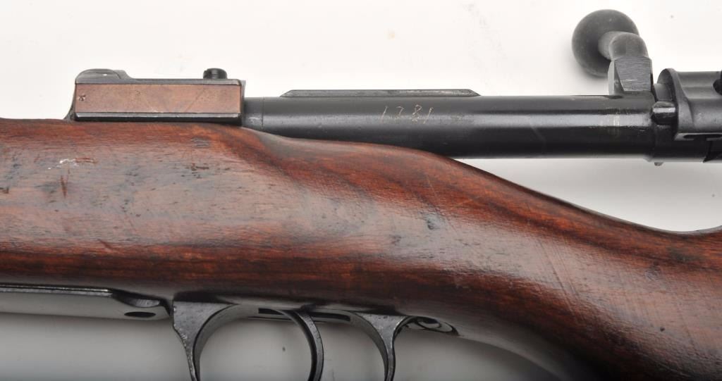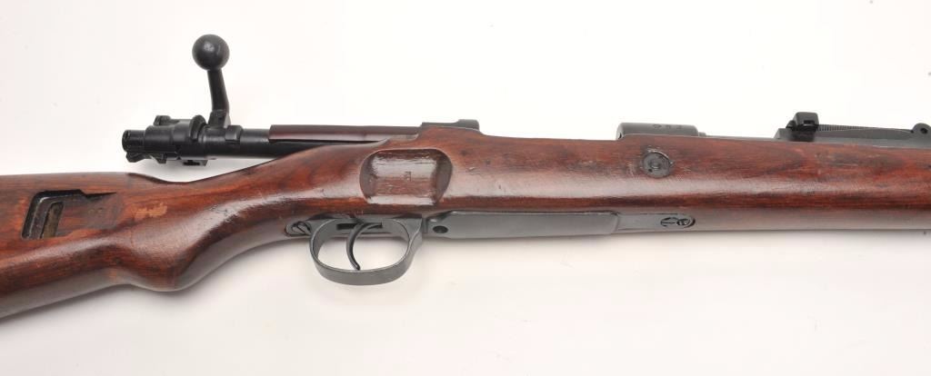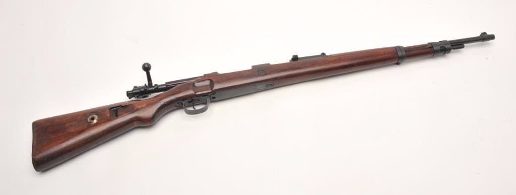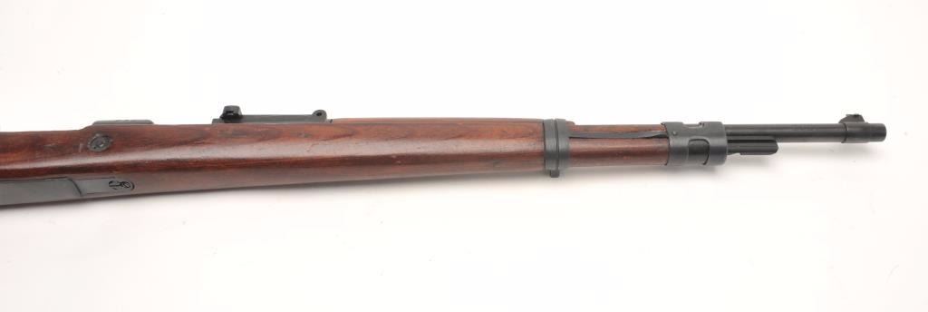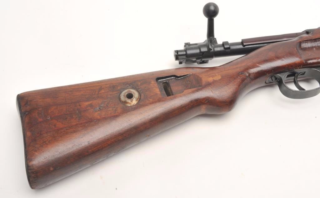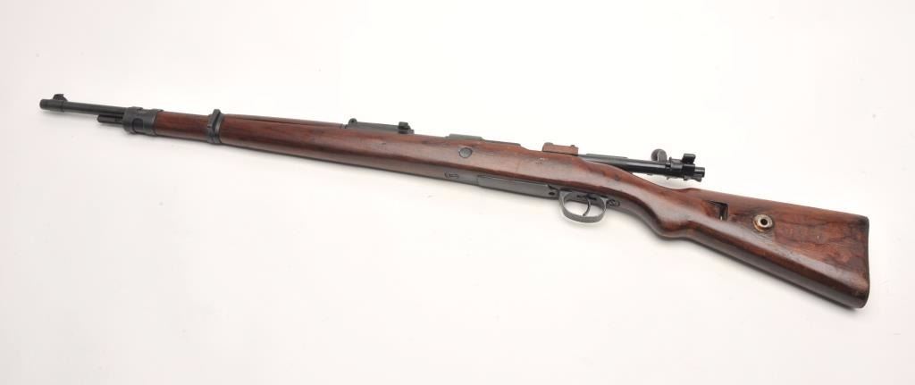 German Mauser Model K98 bolt action rifle, 8 x 57 caliber, serial #1781M. The rifle is in very good overall condition with a 24” barrel featuring a ramp front and military style tangent rear sights. The barrel andreceiver retain the majority of their original military finish moderate wear and light surface rust. The front ring is marked S/42 including the German eagle and is dated 1937. Additionally, the barrel featuresseveral German proofs. The smooth wood stock is in good condition with mars and compressions consistent with service use and a serial number. The butt ends with a smooth steel butt plate. The bore is rough withpitting, the action crisp and markings are sharp on this pre-World War II Mauser. (C+R) Est.: $300-$600.