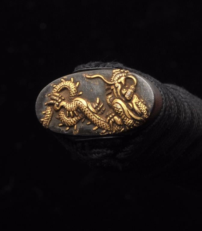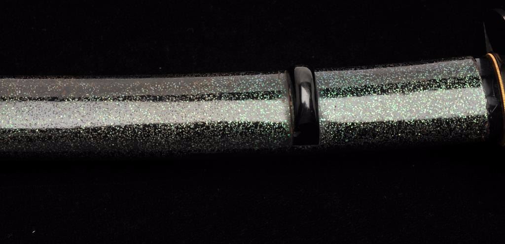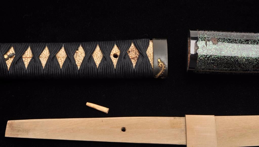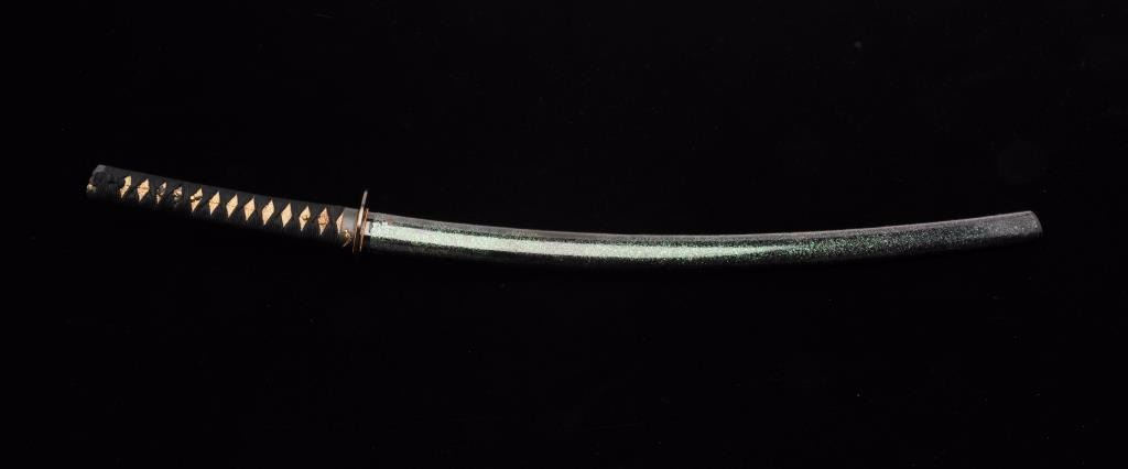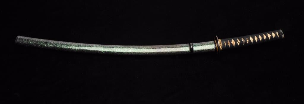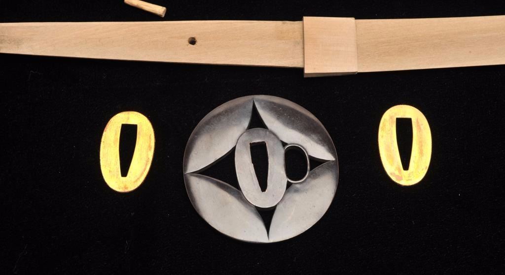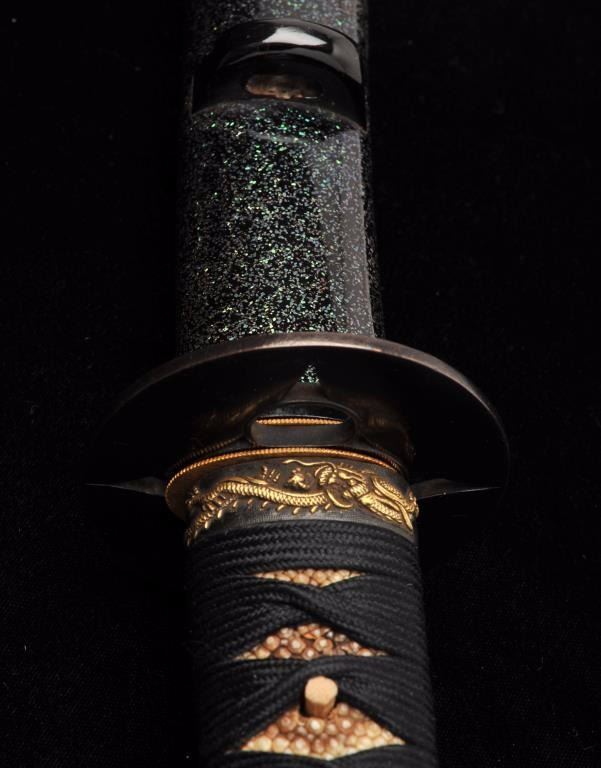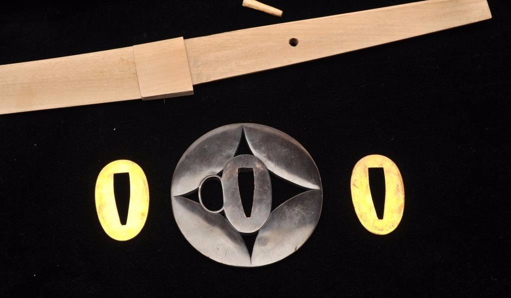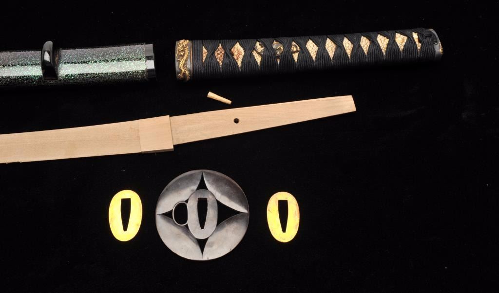 Full mountings for Japanese katana or long sword in excellent restored condition with a 25 ½”- 26 ½” blade. Fancy soft metal menuki (mounts) with black painted brass tsuba. Fancy scabbard. (Fits lot 803 nicely) Est.:$300-$600