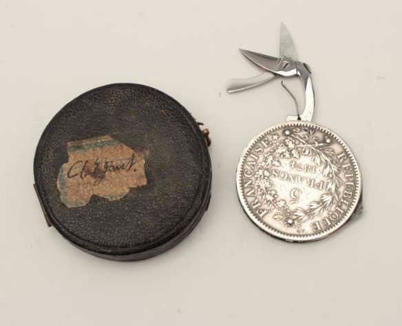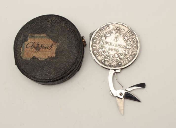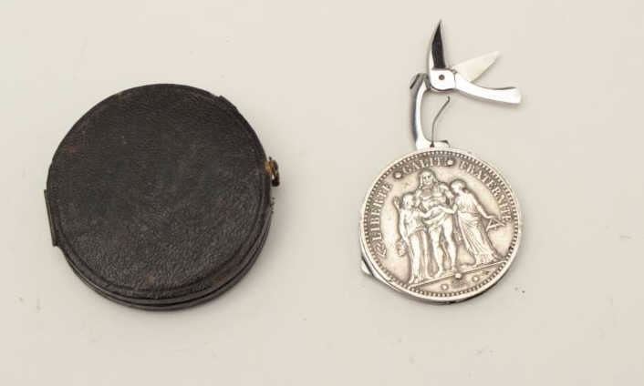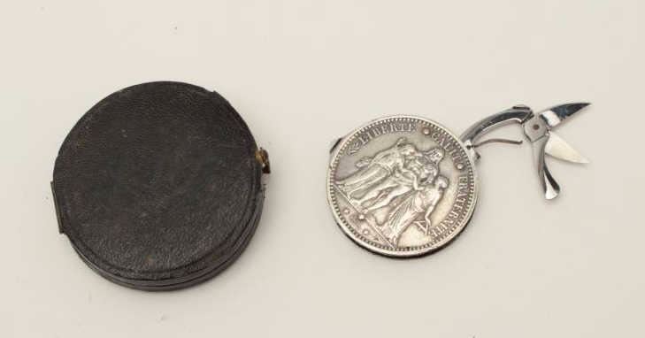 Excellent quality vest pocket accessory for Victorian gentleman smoker small knife blade and scissors for pipe or cigar cutting. The blade is marked “Eloi France”. The body is made from 5 Franc silver coins dated 1874.Excellent condition in case. An unusual item cased in this fine condition. Est.: $300-$600