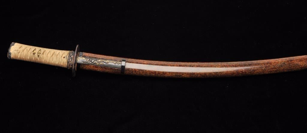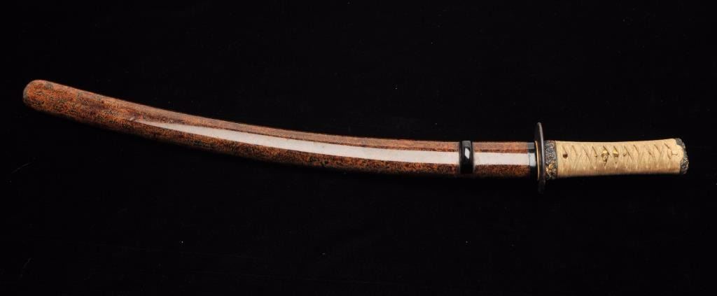 Mounts only for Japanese wakasashi or medium size sword. A fine full mounting including kozuka knife. 15” blade (fairly straight) about 7 1/8” at hibachi (stop). Well matched soft metal fittings and menuki fine and fancy lacquered scabbard. Old and antique white cord wrapped grip possibly for court use. A very nice set of mounts. Est.: $300-$600