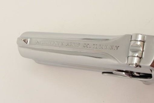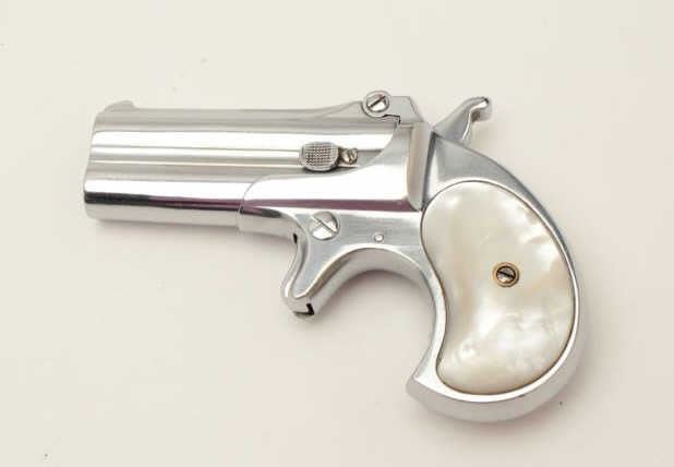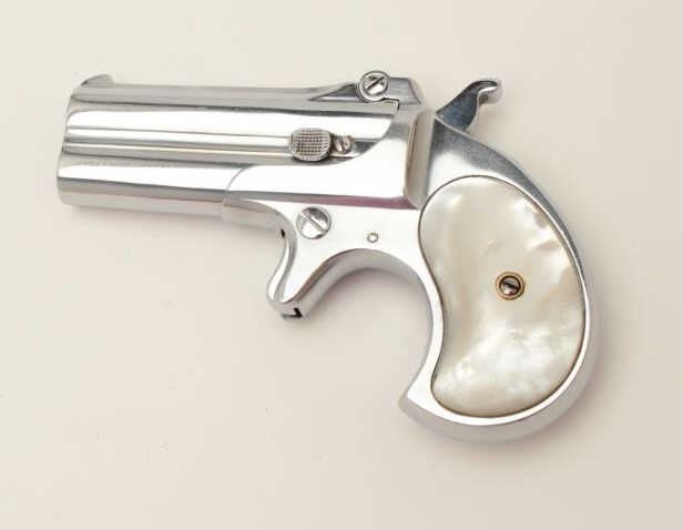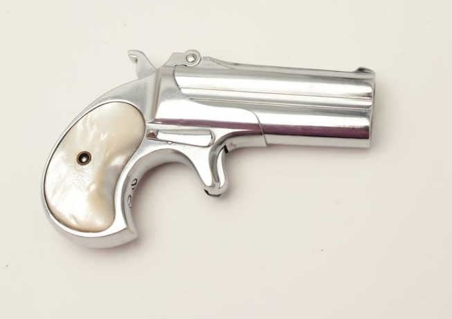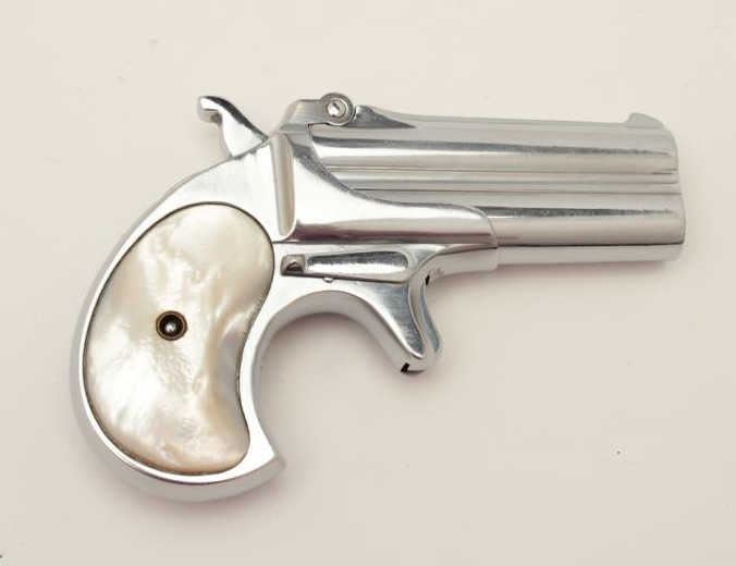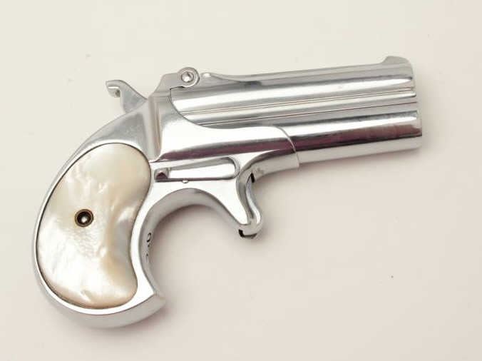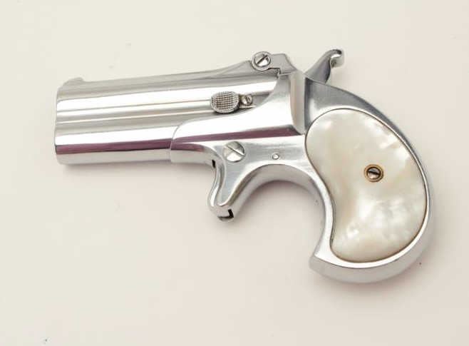 Lot 738 Remington O/U derringer, .41 caliber, 3” barrels, re-nickeled finish, pearl grips, S/N 429, in ove
