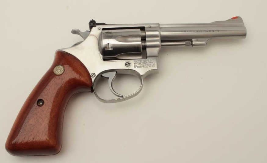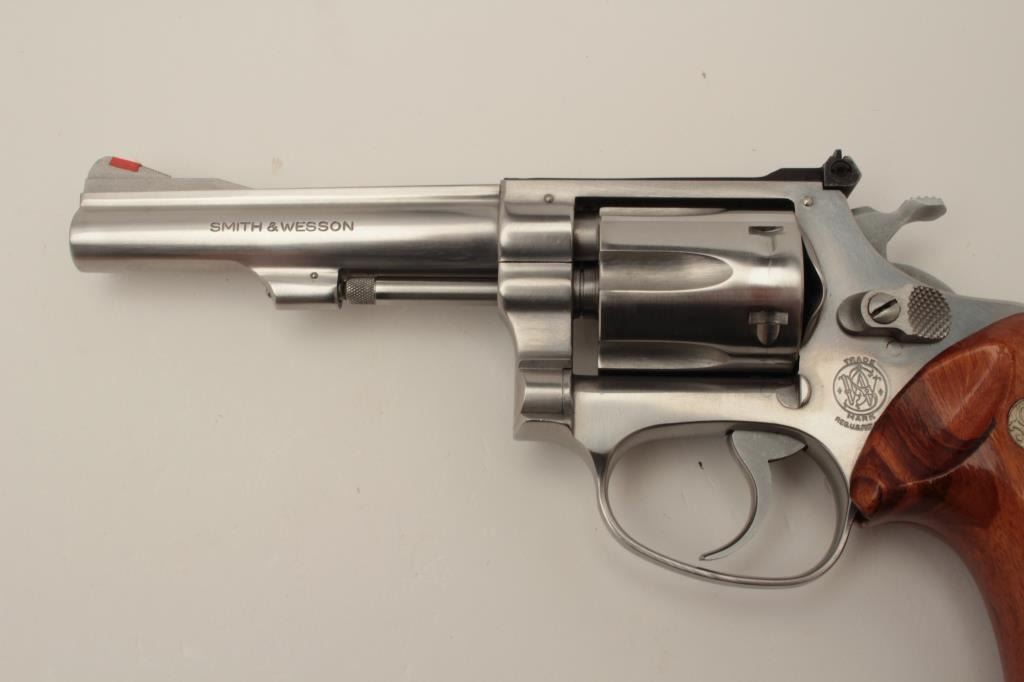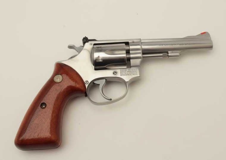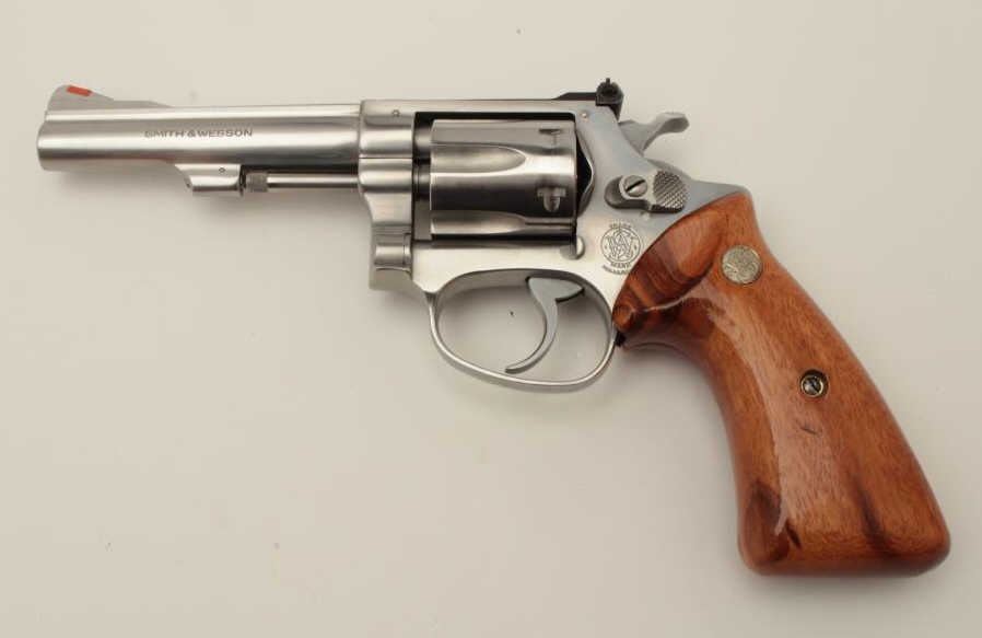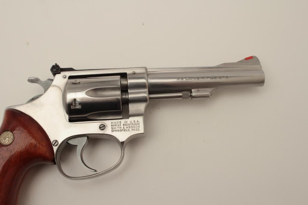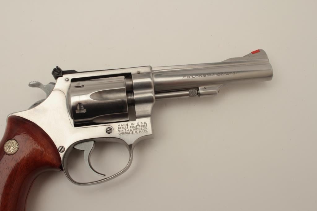 Smith & Wesson Model 63 DA revolver, .22LR caliber, 4” barrel, stainless, smooth wood medallion grips, S/N M126727, in overall excellent condition showing little handling. (Modern/PPT). Est.: $400-$800.