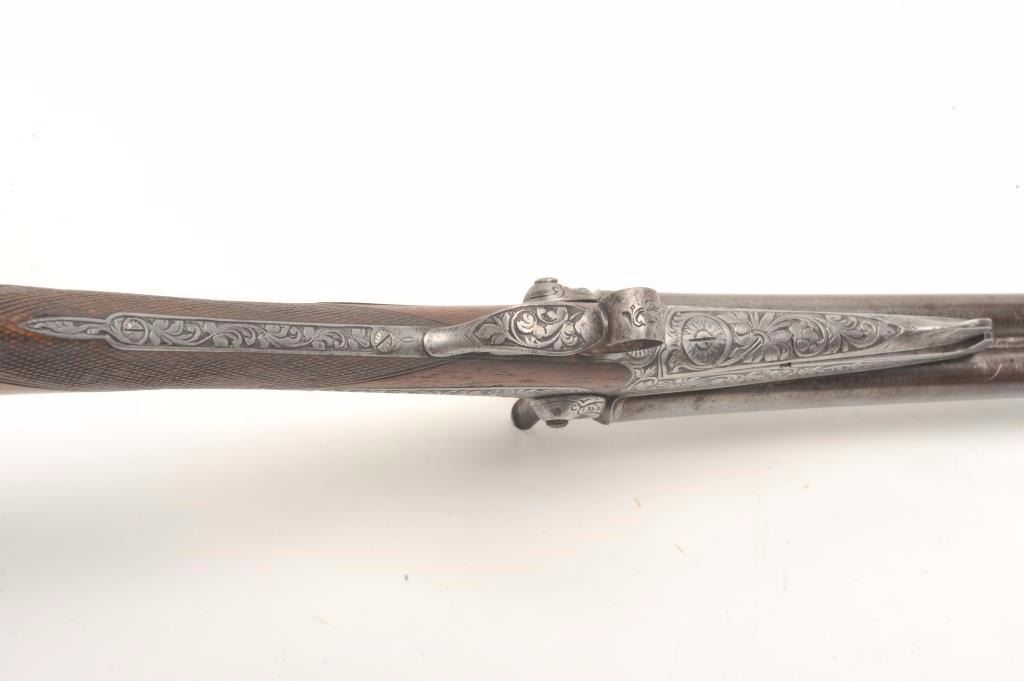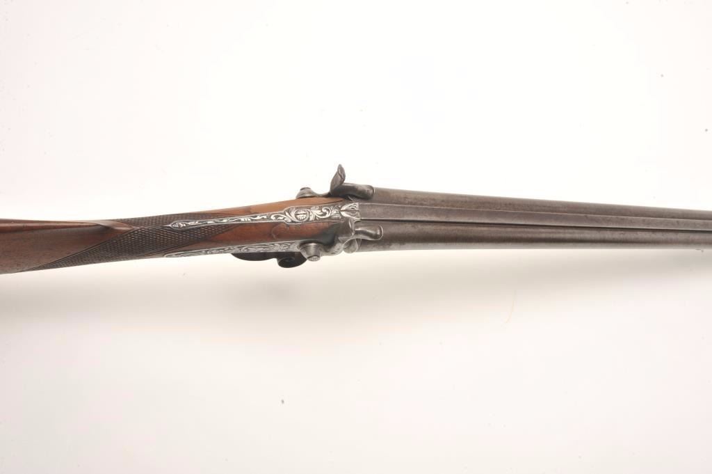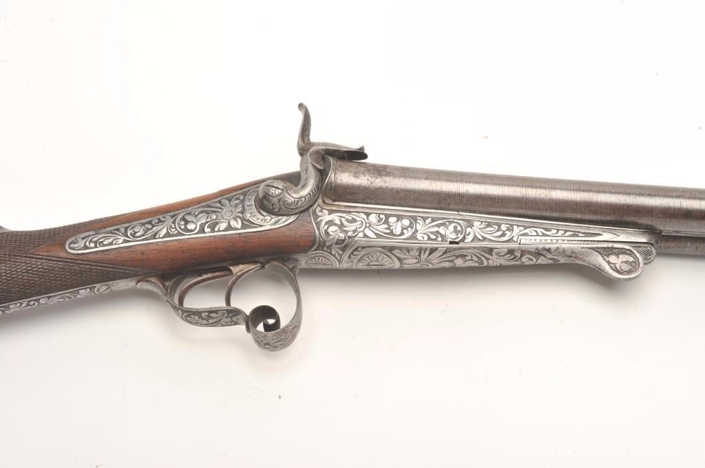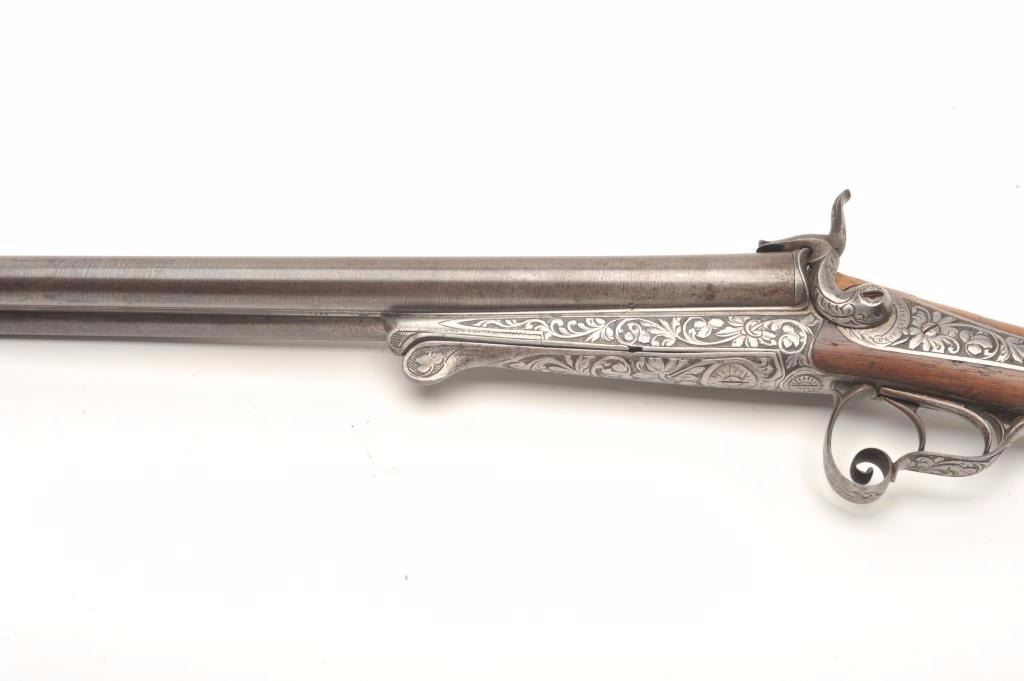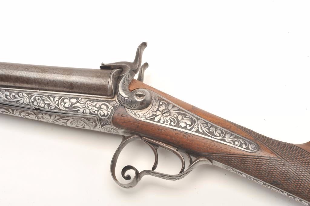 Lot 748 French SxS pinfire shotgun signed “Brun-Latridge A St. Etienne” behind the hammers. Deep floral sc