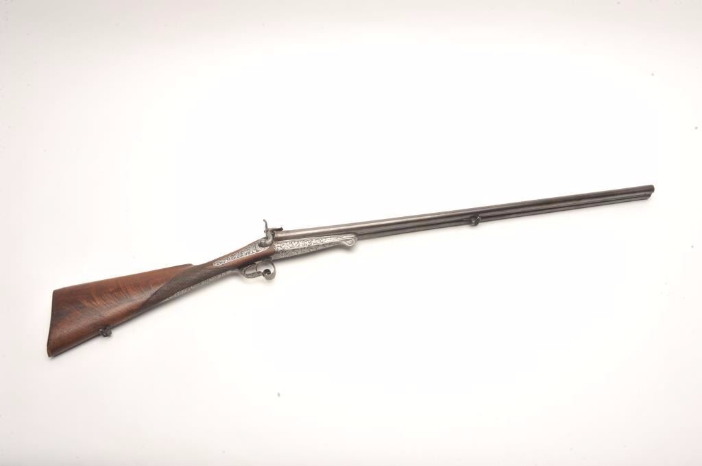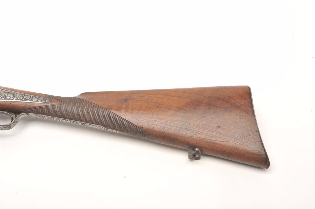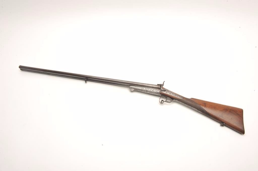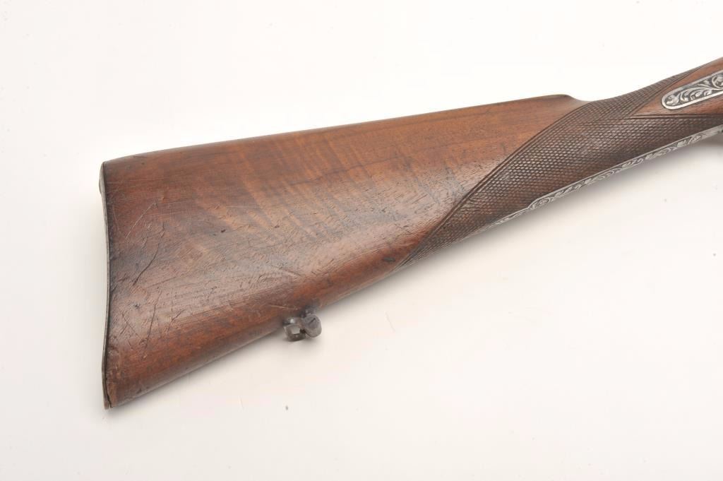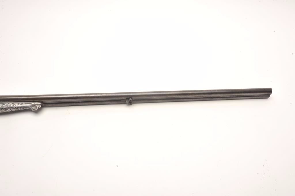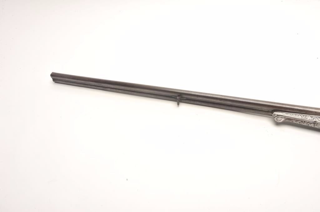 Lot 748 French SxS pinfire shotgun signed “Brun-Latridge A St. Etienne” behind the hammers. Deep floral sc