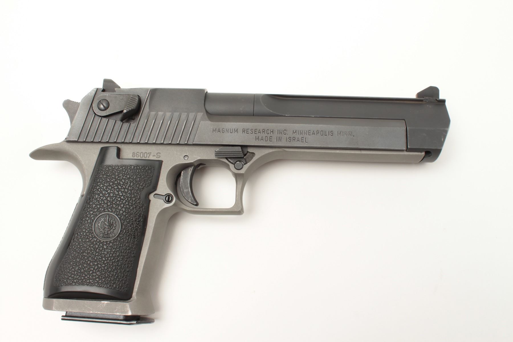 Magnum Research Desert Eagle semi-automatic pistol, .44 Magnum caliber, 6” barrel, mat finish, stippled hard rubber grips, S/N 86007-S, in overall very good + condition with a crisp action, sharp markings, verygood to near fine bore and grips; front sight shows some knackering at base and may be a replacement. A massive handgun made in Israel. (Modern/PPT). Est.: $500-$1,000.