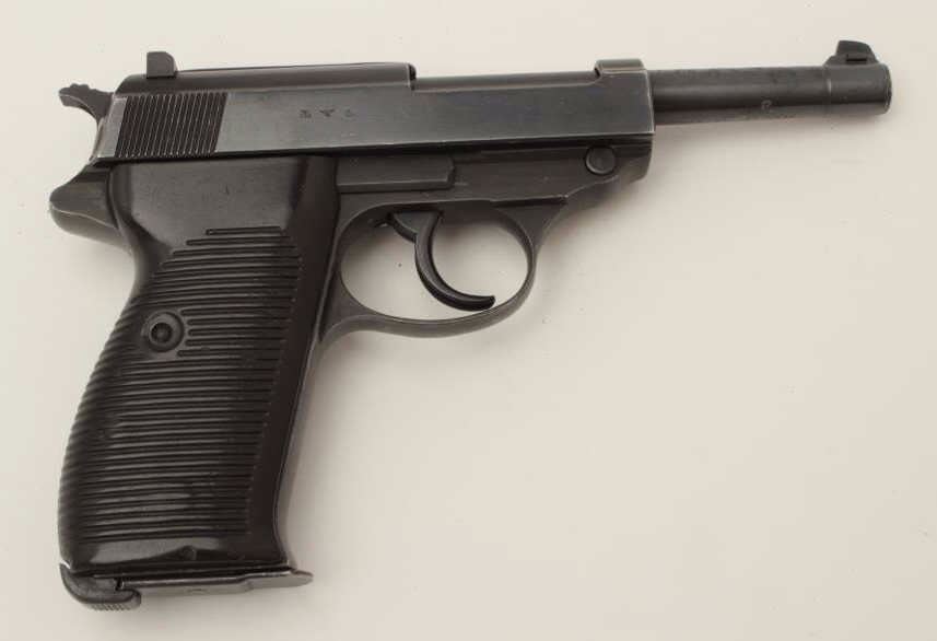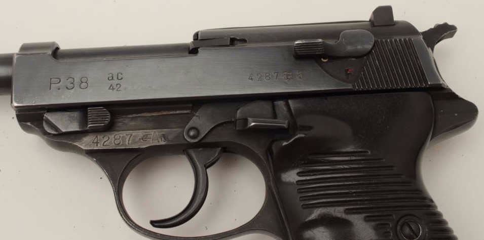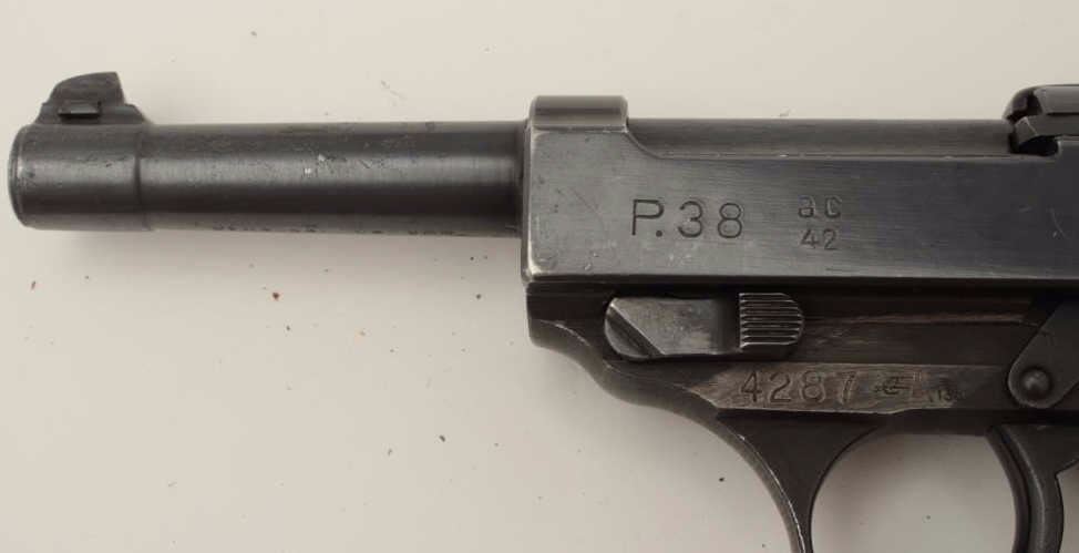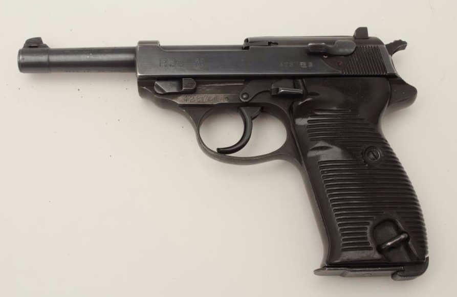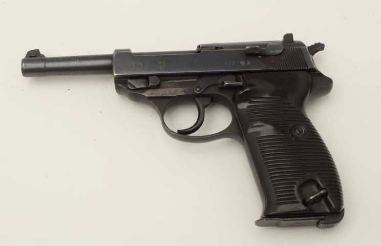 Walther P-38 DA semi-automatic pistol, 9mm caliber, 5” barrel, nazi proofed, import-marked, blued finish, black grips, S/N 4287e, in overall very good condition showing the majority of its military finishwith areas if pitting confined primarily to the top of the barrel, very good bore, crisp action, good markings and grips. (C&R/PPT). Est.: $500-$1,000.