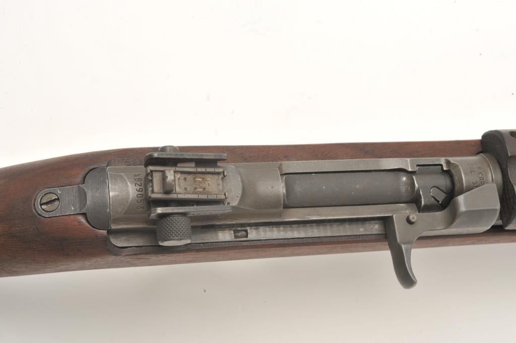 U.S. M1 semi-auto carbine by Quality Hardware, .30 caliber., 18” Underwood barrel dated 9-43 with the flaming bomb, military finish, wood stock , no magazine, later sight, flat bolt, bayonet lug, serial#4829053. The smooth wood stock has no visible cartouches but is otherwise in very good overall condition showing small compressions and storage marks with a checkered steel butt plate. The carbineitself is in very good overall condition showing considerable military finish with an import marked barrel showing light surface rust at the muzzle. The bore is good, the action crisp and markings are sharp on thisdesirable Quality Hardware M1. (C+R) Est.: $400-$800.