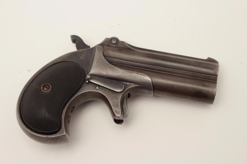 Remington O/U derringer, .41 caliber, 3” barrels, blued finish, checkered hard rubber grips, S/NL90330, in overall good condition with a grey patina showing hints of original blue in protected areas, good action andmarkings, fair bores, good grips. (Antique). Est.: $300-$600.