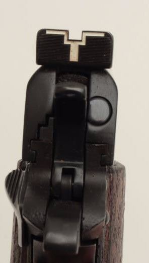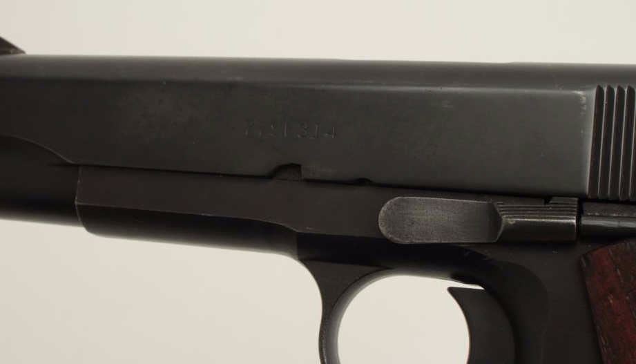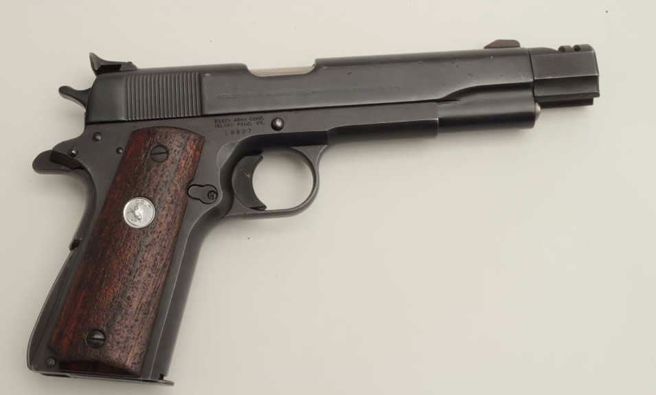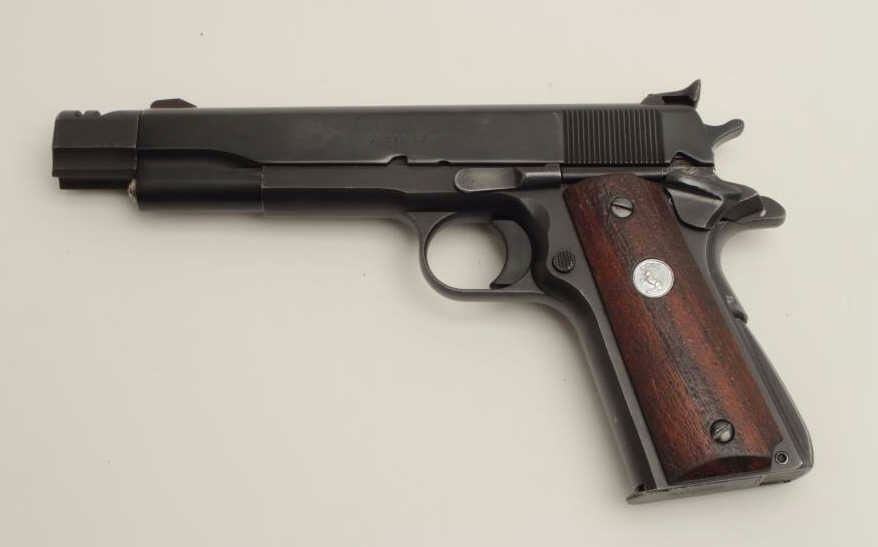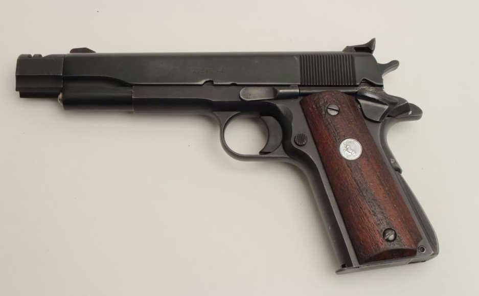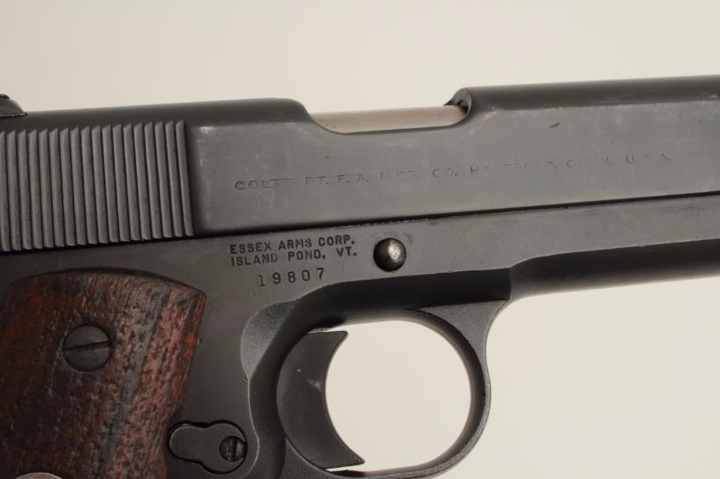 Essex Arms Corp. frame with Colt slide and barrel assembly, custom .45 caliber semi-automatic target pistol, 6” barrel including ported muzzle compensator, re-blued finish, wood Colt medallion grips, S/N 19807 (slide #7790314), in overall very good + condition with very good to near fine bore, crisp action, very good grips, Randall magazine. (Modern/PPT). Est.: $500-$1,000.