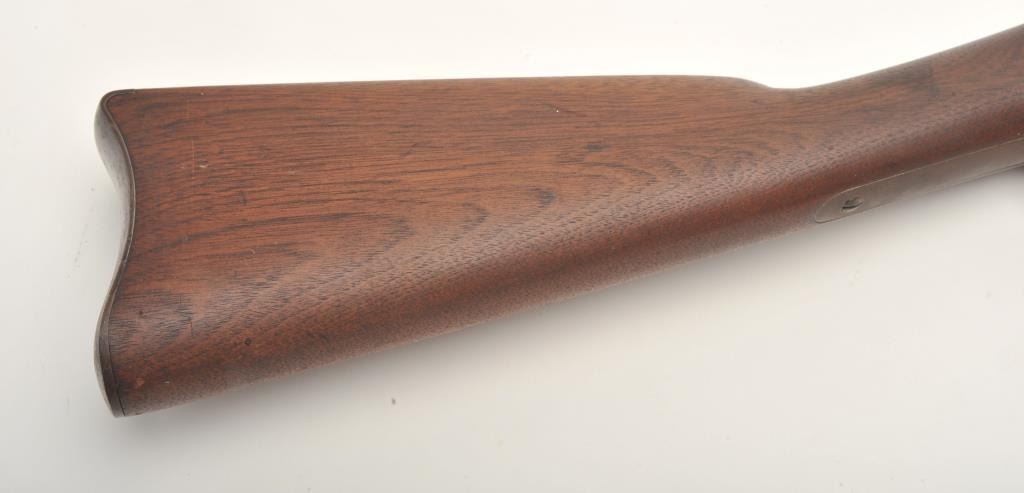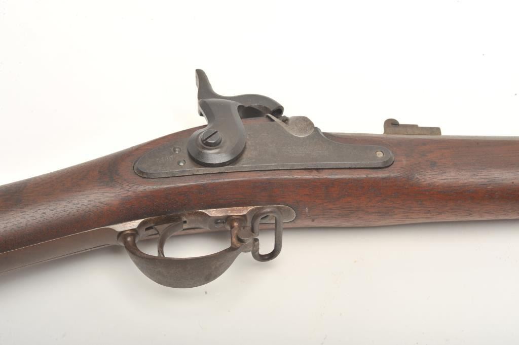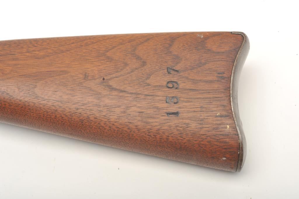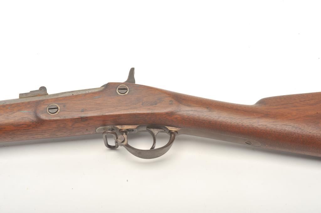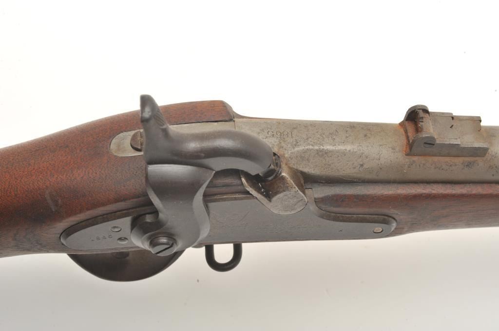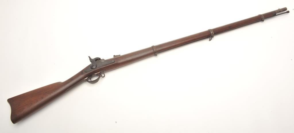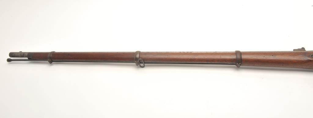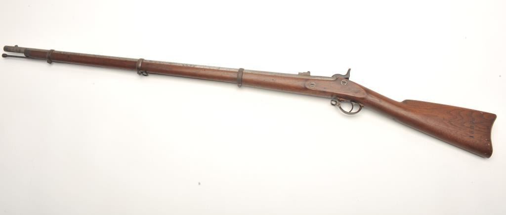 Remington 3-band percussion rifle, .58 caliber, 39.5” barrel, full length wood stock with iron ramrod. This rifle is in overall good to very good condition showing scattered spots of erosion on the barrel, crisp action and sharp markings with the date 1865 on both the lockplate and on top of the barrel at the breech. The wood stock is overall very good with the number “1397” stamped in the left side of the butt stock anddisplaying an inspector’s cartouche on the left side of the stock above the trigger. (Antique). Est.: $600-$1,200.
