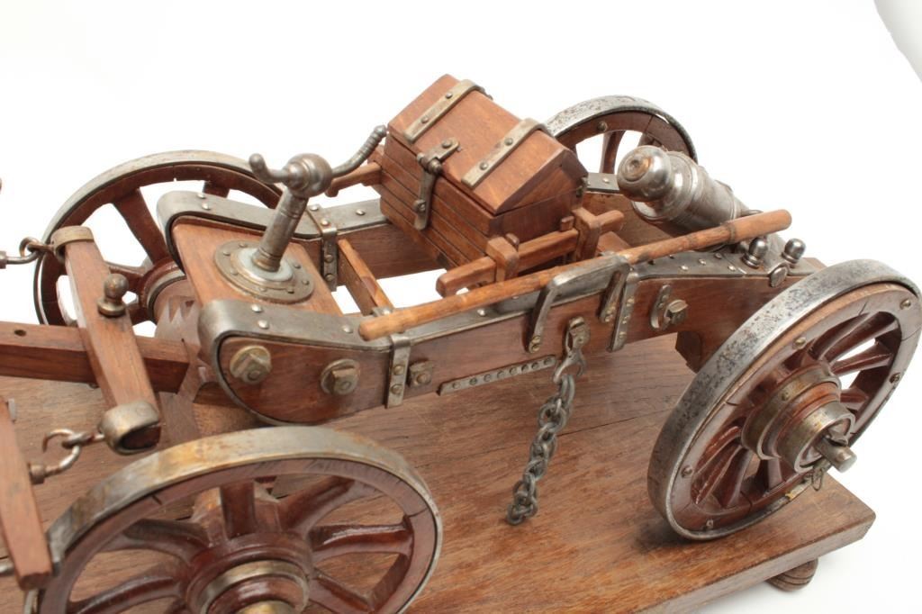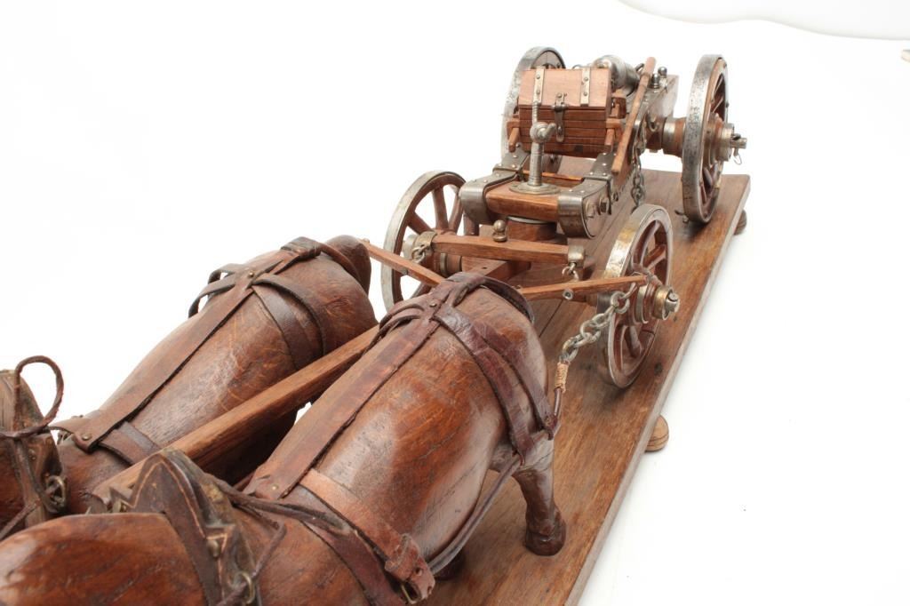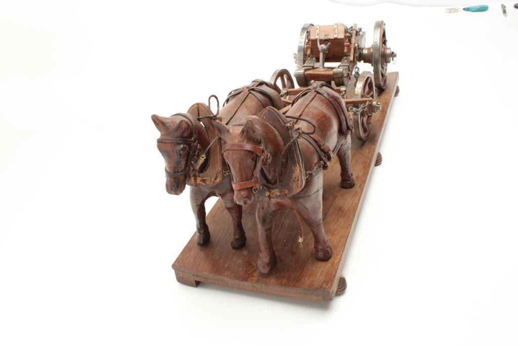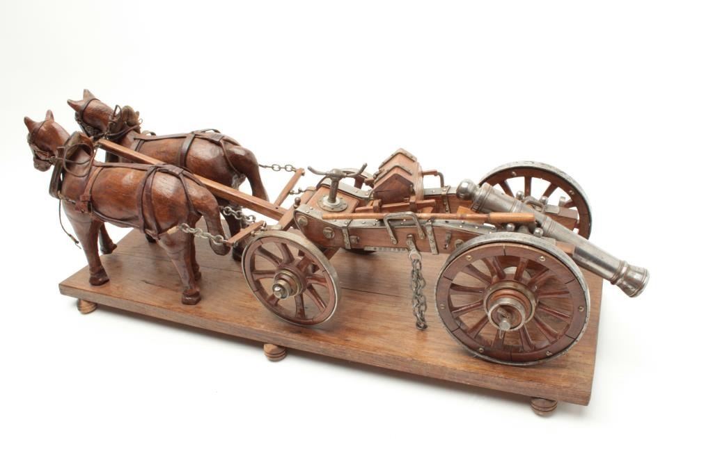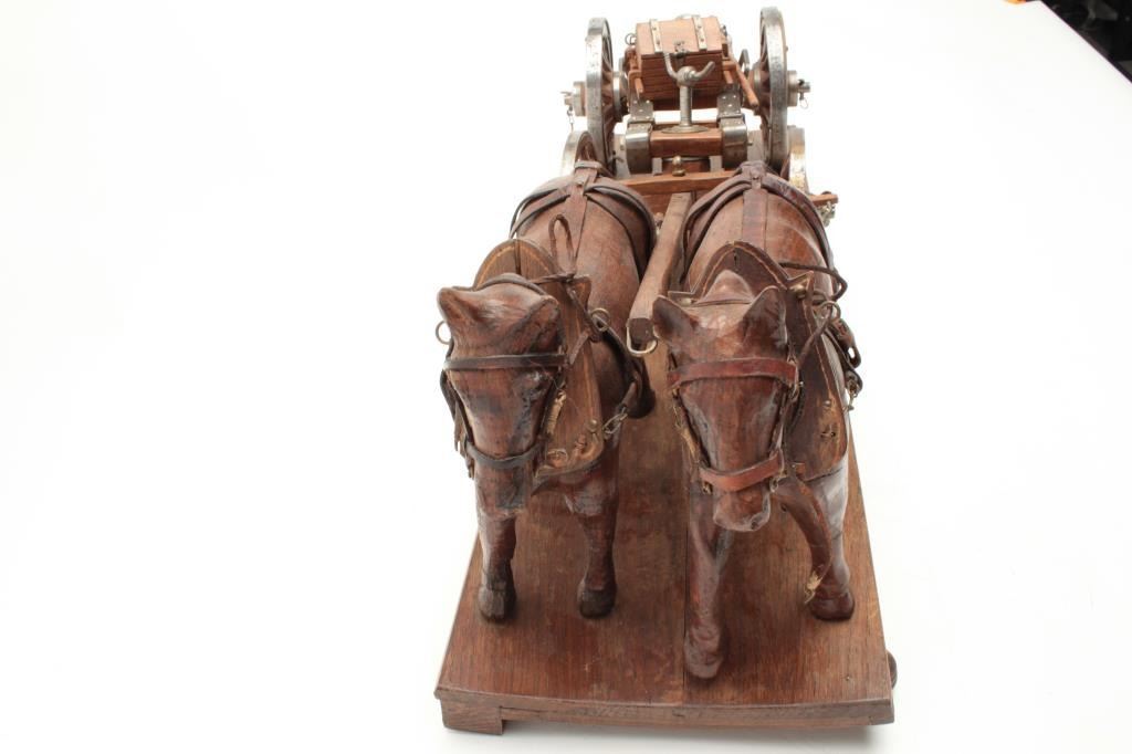 Minature Horse drawn artillery cannon with complete handmade carved wood horses, turned metal and hand fabricated mounts; leather reins and rigging; 19th to 20th Century; approximately 27.5” overall on wood base, 9”wide and 11” tall. Est.: $600-$1,200.