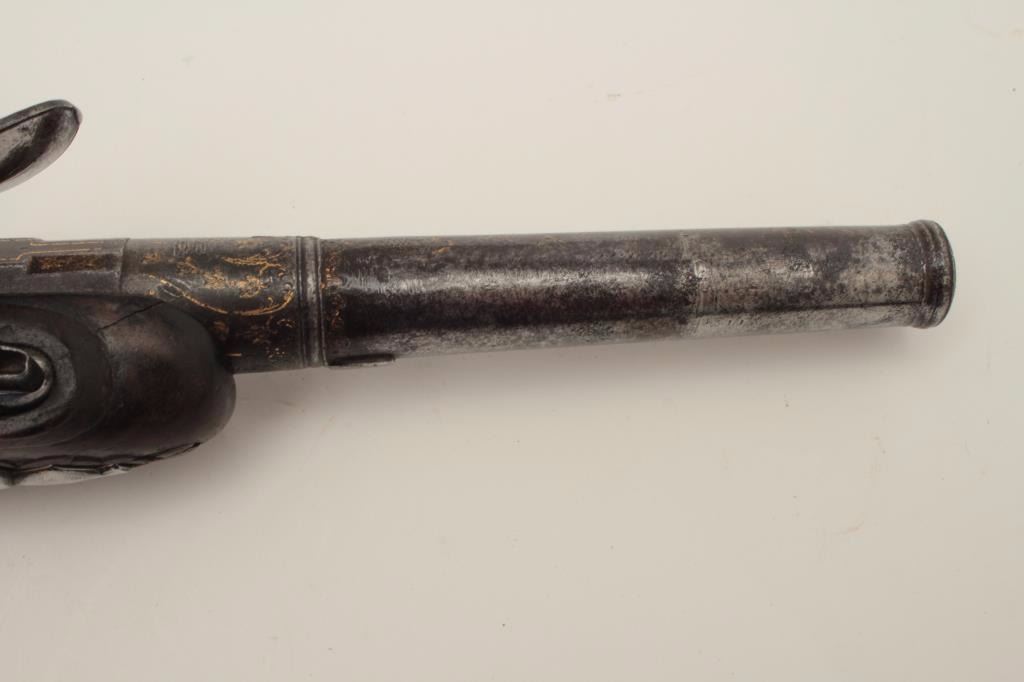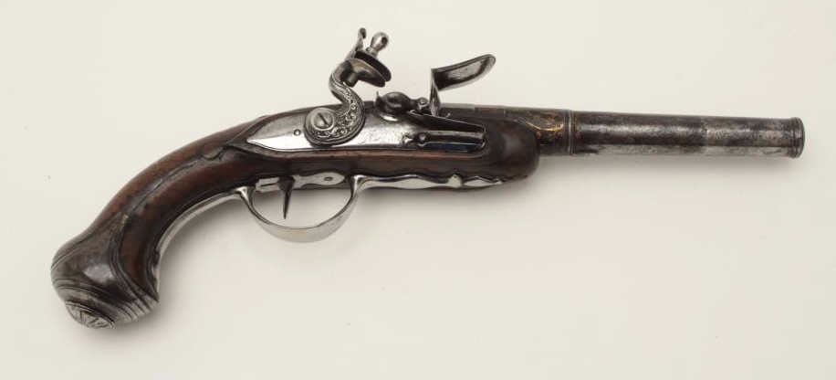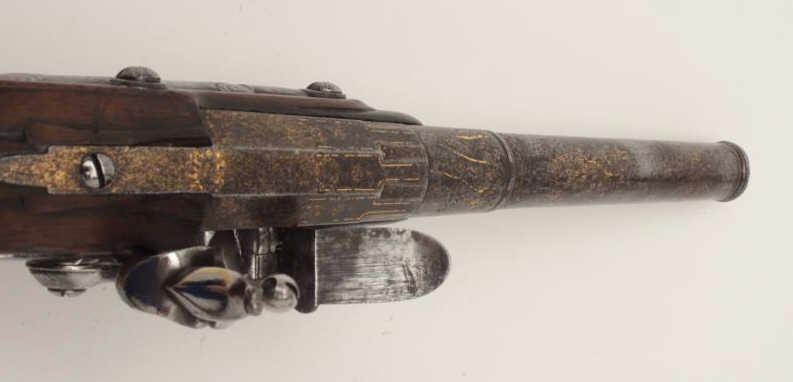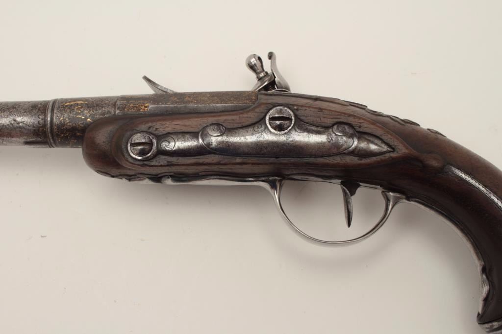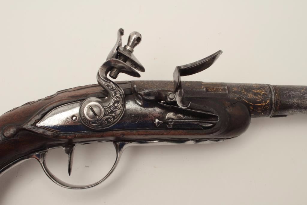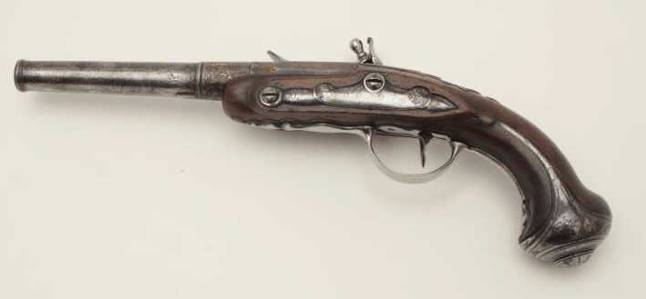 Lot 777 18th century flintlock pistol with screw barrel and lock engraved in script “Manafac-A-Royal at St