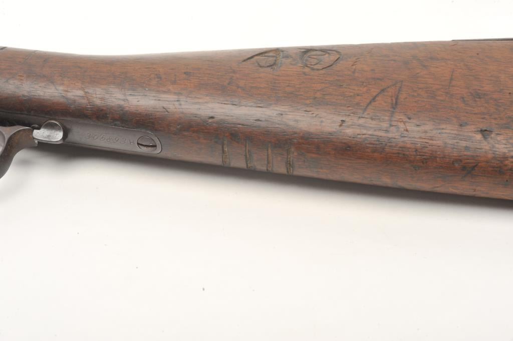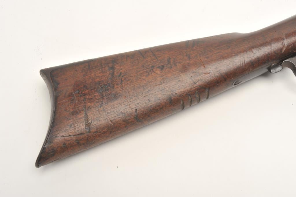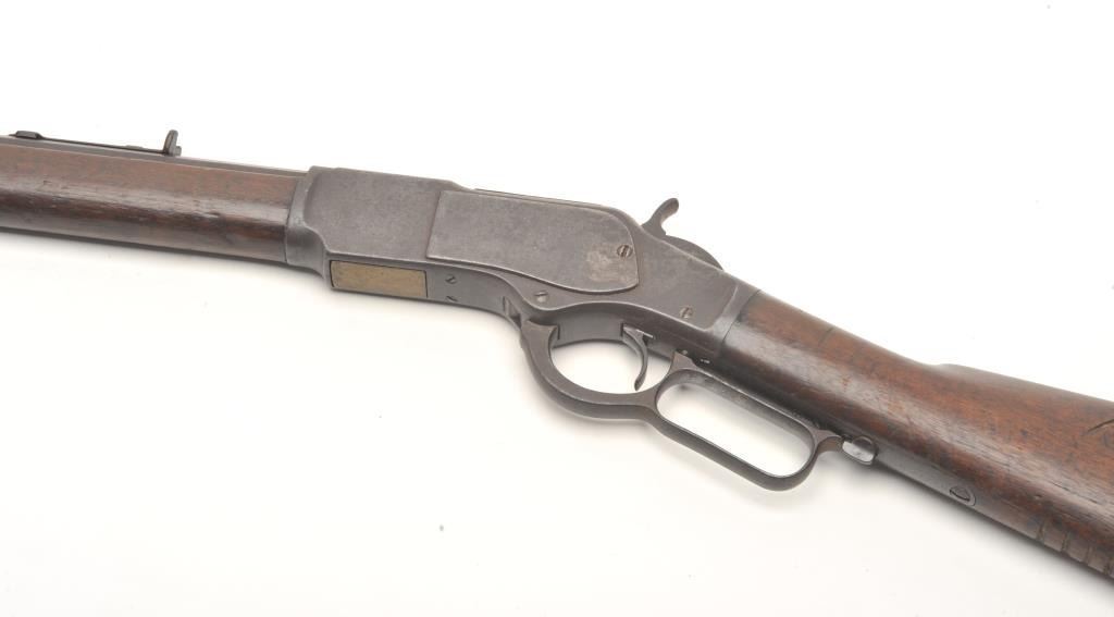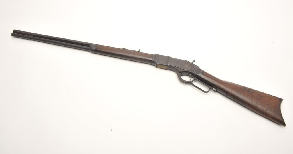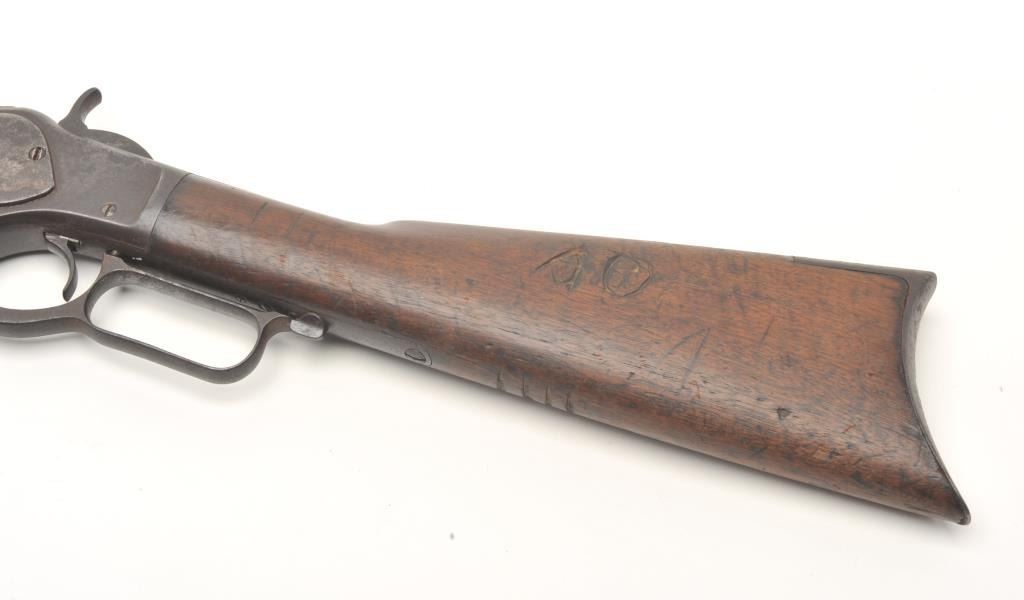 Winchester Model 1873 lever action rifle, .38 W.C.F. caliber, 26” octagon barrel, wood stocks, S/N 305893B, in overall good condition showing a dark patina to metal surfaces, good action and good markings; wood butt stock shows old hand-carved “AO” on left side, scattered old mars, scratches and discoloration and four “hash tags” on bottom of butt stock; dust cover missing. Accompanied by a factory letter confirmingcaliber, barrel length and plain trigger; received in warehouse on Sept. 19, 1889 and shipped with 8 other guns on the same date to order #2347. This gun was previously in the famous James D. Gordon collection and ispictured on pages 163 and 166 in Gordon’s book, “Winchester’s New Model of 1873, a Tribute”. (Antique). Est.: $1,250-$2,500.