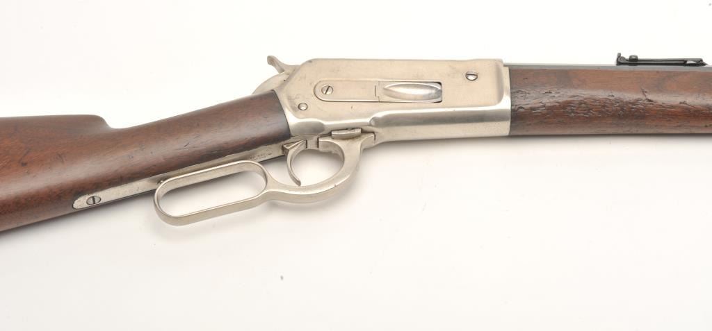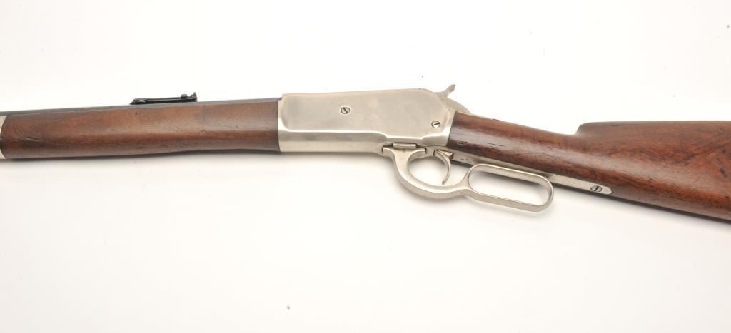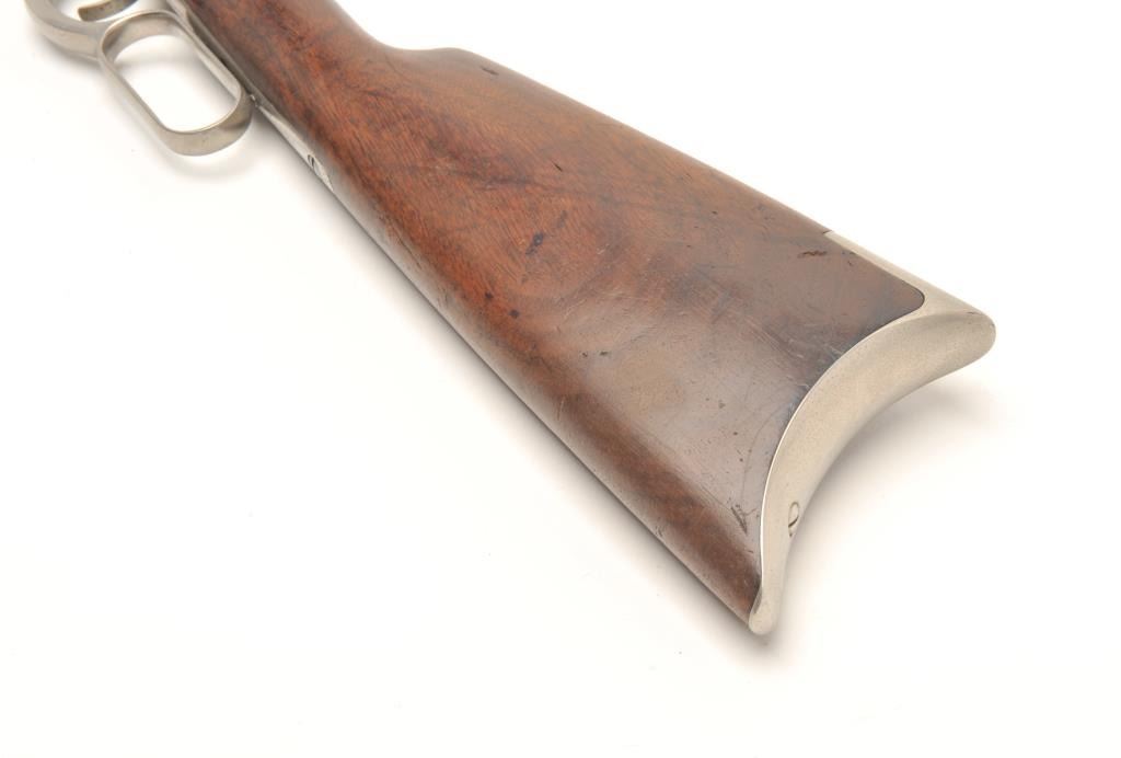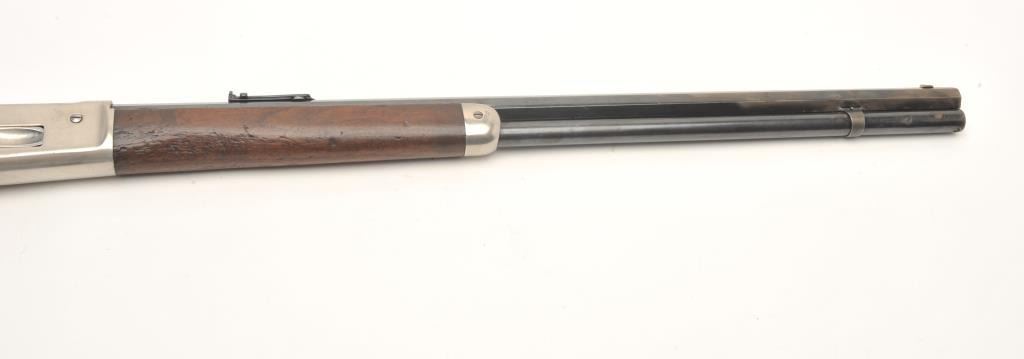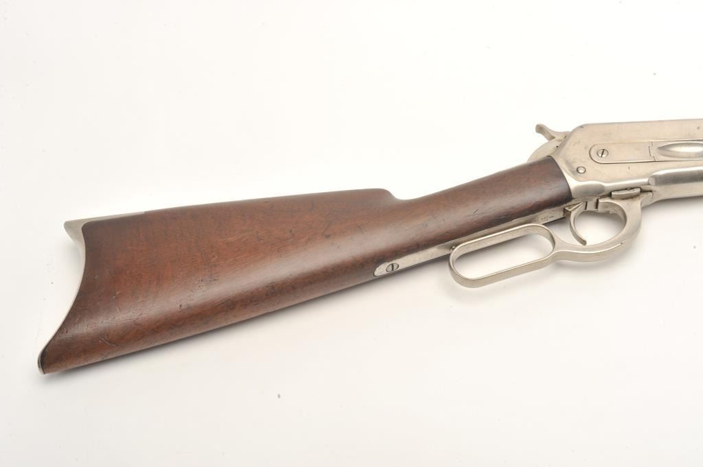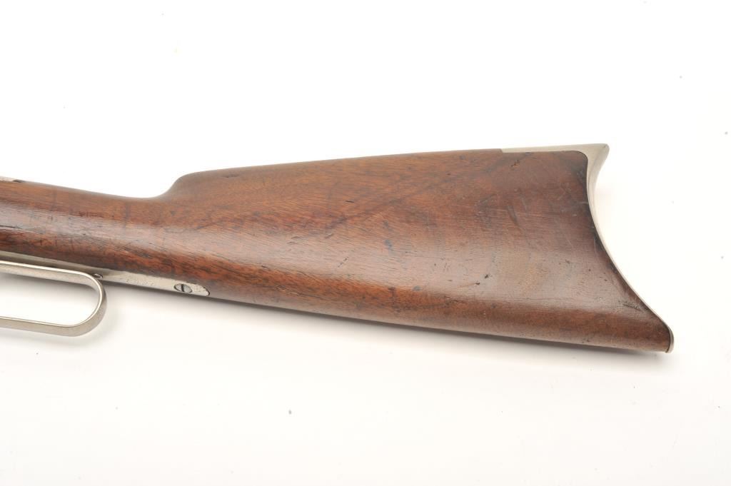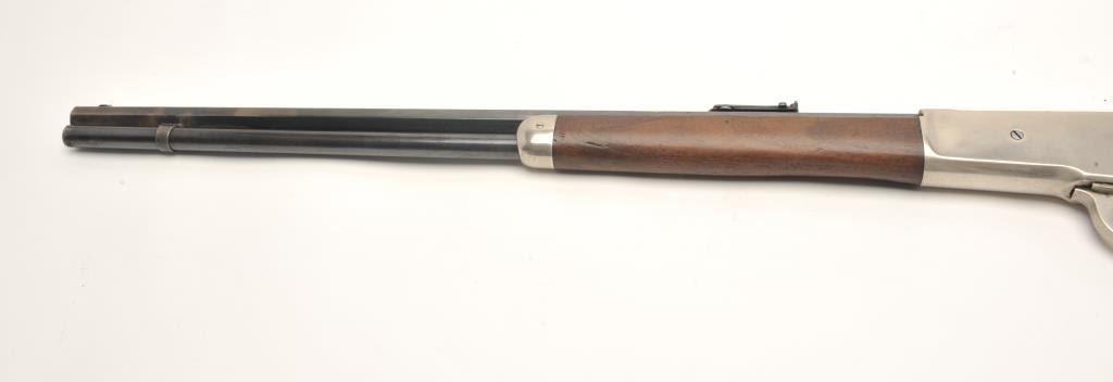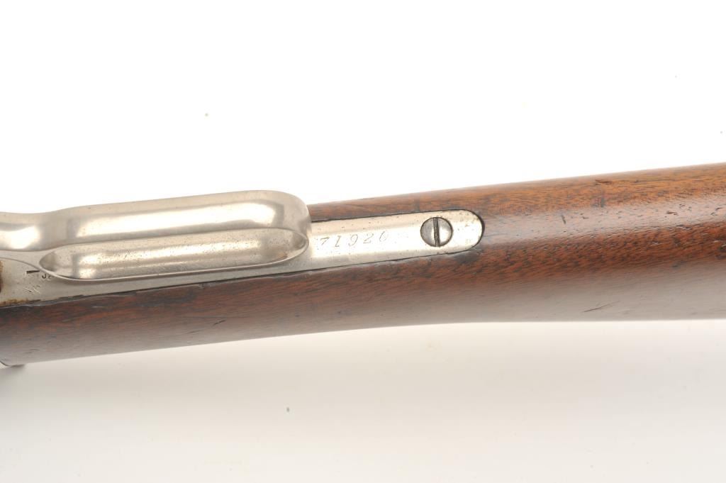 Winchester Model 1886 lever action rifle, .45-70 caliber, 26” octagon barrel, old re-finish of blue to barrel assembly and nickel to receiver and butt plate, wood stocks, S/N 71920, in overall good conditionas re-finished, some wear spots on front of barrel, crisp action, fair to good bore, forend shows some pommel wear near frame, butt stock overall good. Factory letter copy included confirming caliber, octagon barrel, plain trigger and indicating received in warehouse on November 21, 1892 and shipped on Dec. 1, 1892 with 219 other arms to order #10843. (Antique). Est.: $900-$1,800.