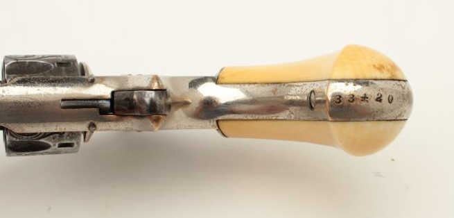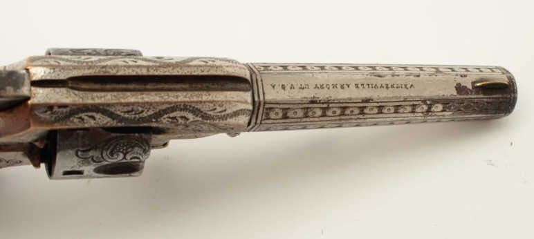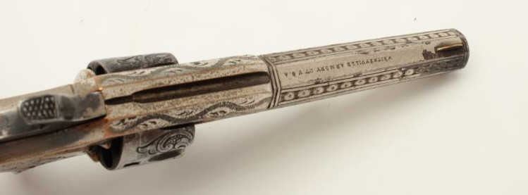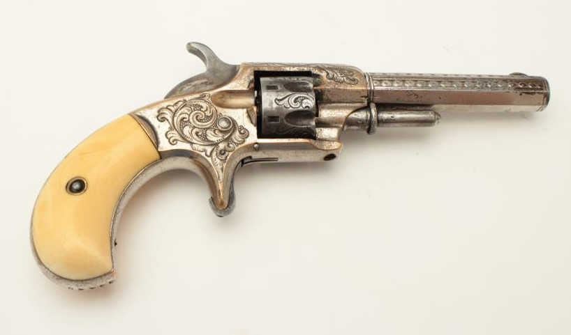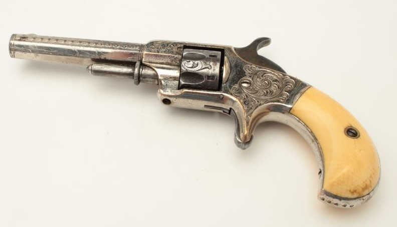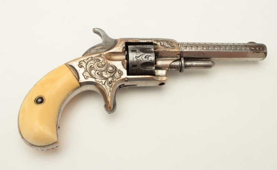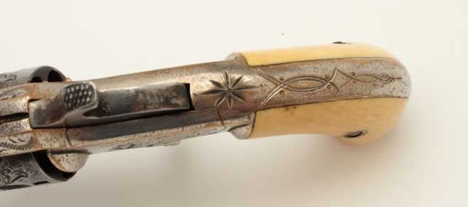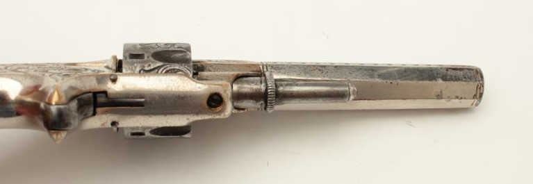 Lot 791 Whitneyville .22 caliber spur trigger revolver, 3.25” octagon barrel, fully engraved, nickel, ivor