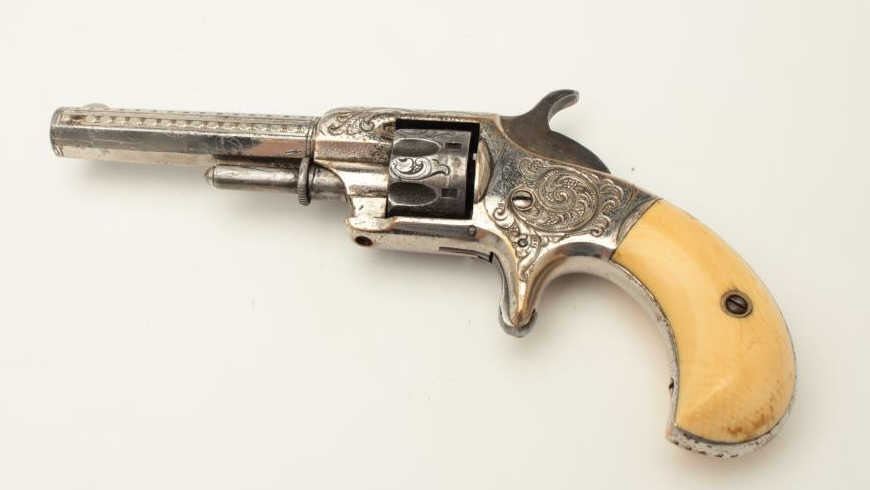 Whitneyville .22 caliber spur trigger revolver, 3.25” octagon barrel, fully engraved, nickel, ivory grips, S/N 33420, in overall very good condition. (Antique). From the Whitney family collection. Est.: $400-$800.