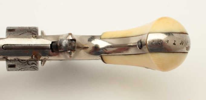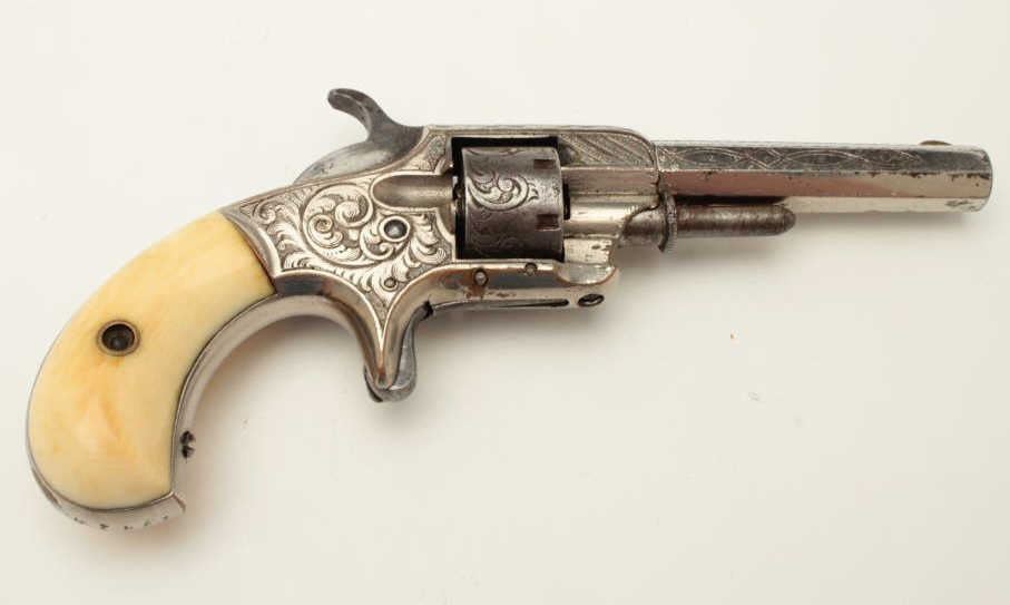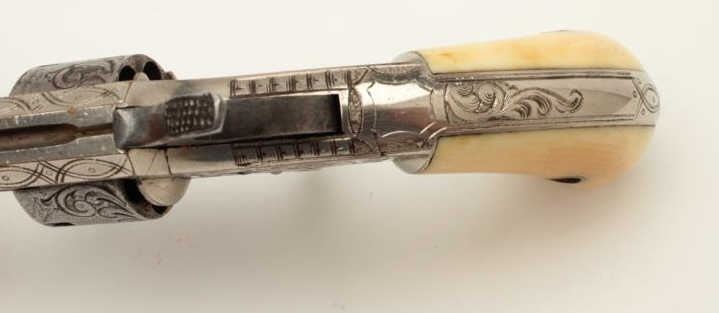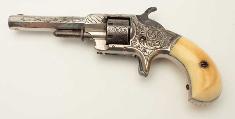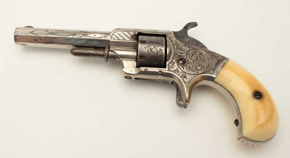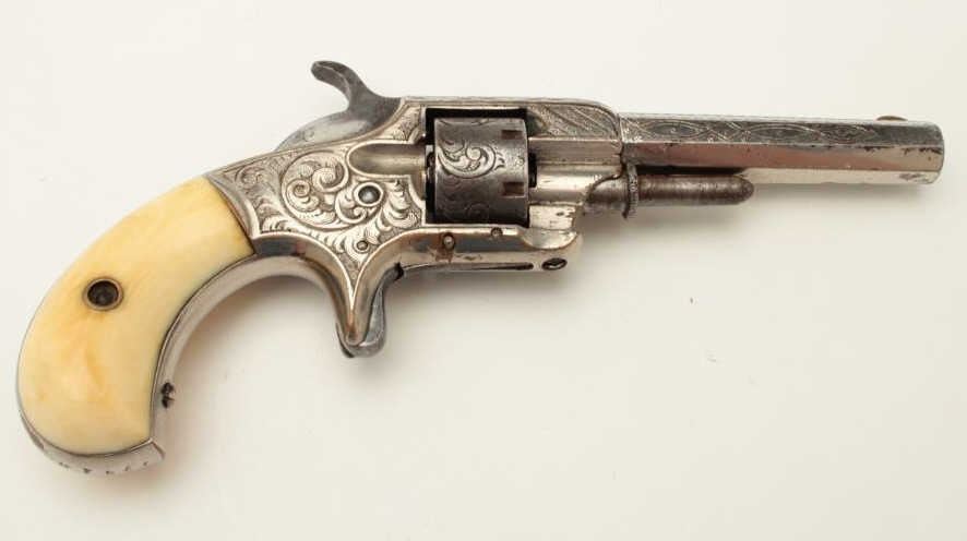 Whitneyville .22 caliber spur trigger revolver, 3.25” octagon barrel, non-fluted cylinder, fully engraved, ivory grips, early configurations to front of frame, S/N 9261B, in overall very good to near fine condition. (Antique). From the Whitney family collection. Est.: $500-$1,000.