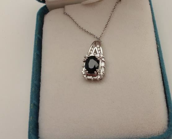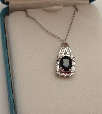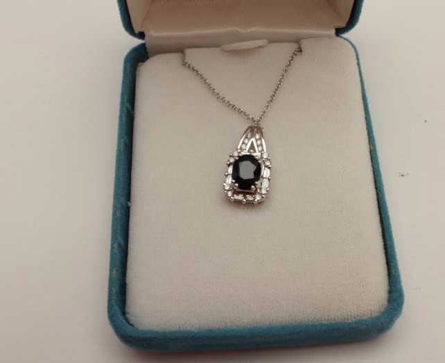 Lot 799 One 2 ct blue sapphire pendant made in 14k white gold set with round diamonds and tapered baguet