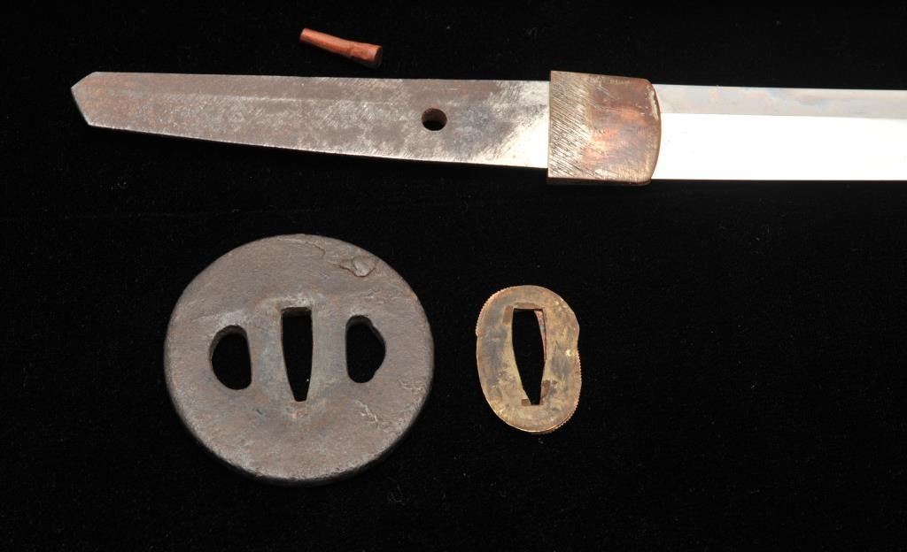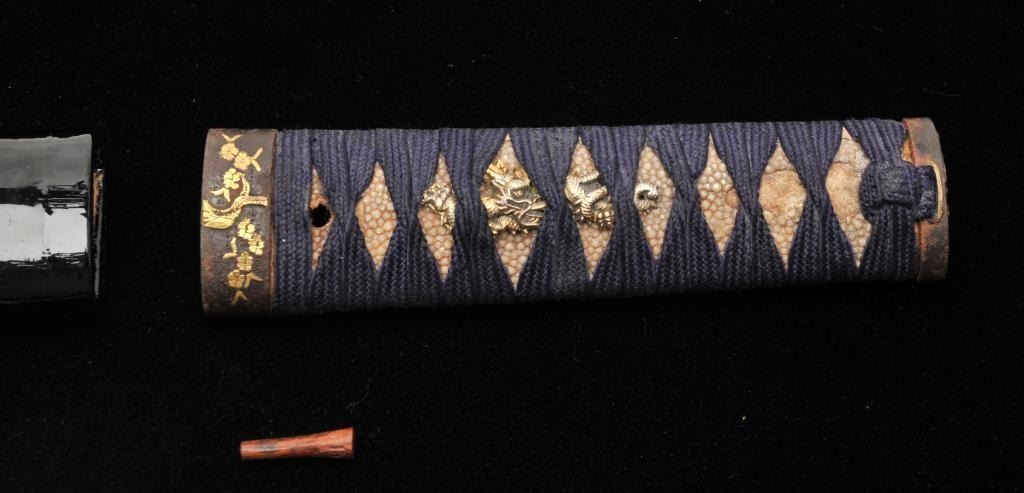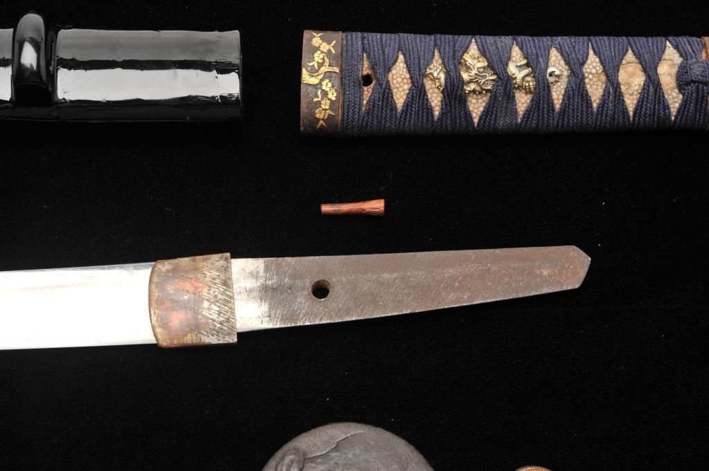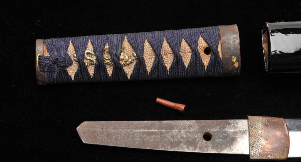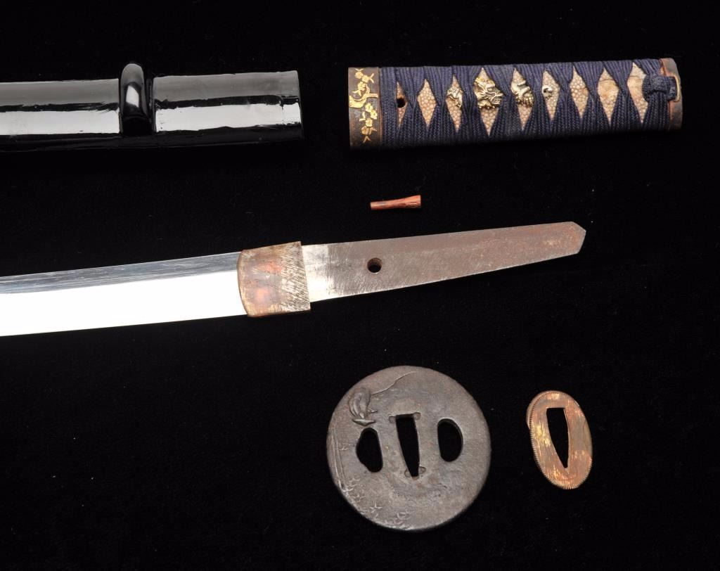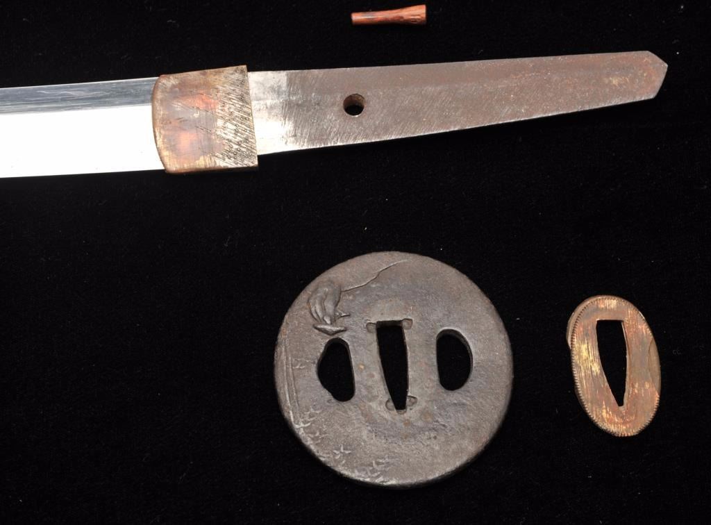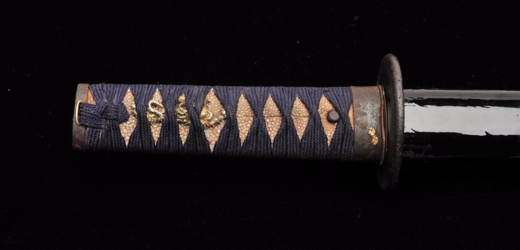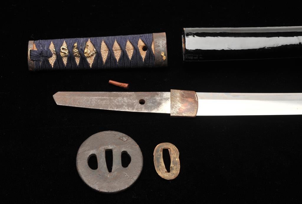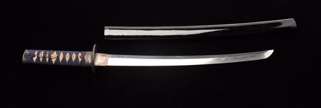 Koto period wakasashi (Medium size) unsigned in full mountings. The blade is 17” in length and shows full polish. Nice temper line and only minor imperfections. The scabbard and grip are restored. Old tsuba with fancyfittings. Est.: $600-$1200