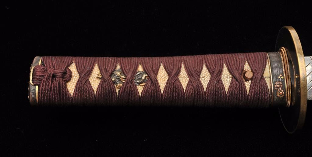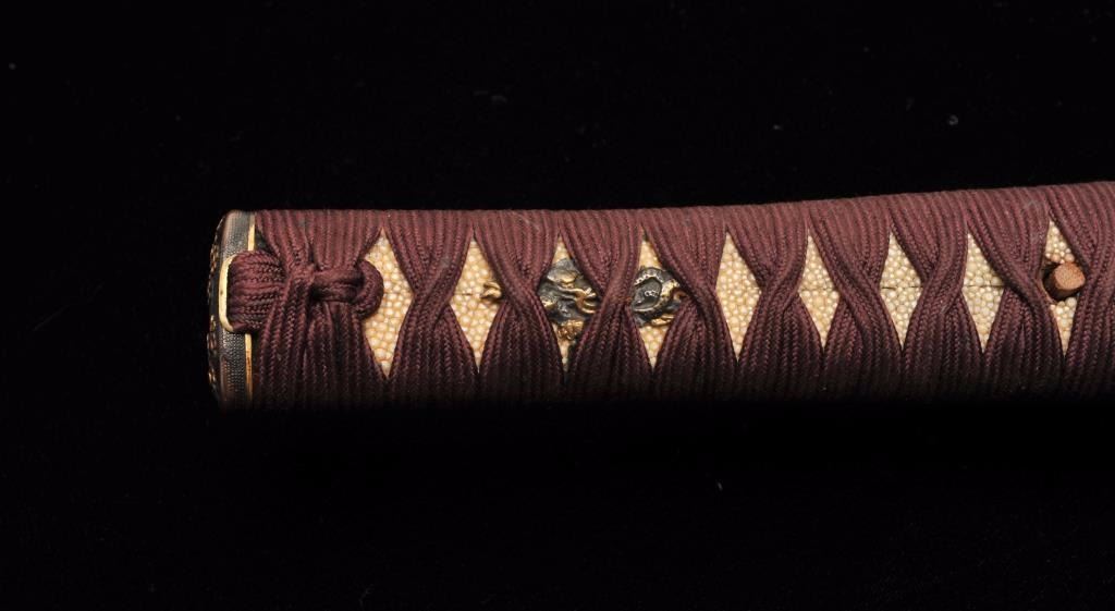 Koto period wakasashi (medium sword) with full and fancy traditional style mountings. The blade is 17 ½” in full polish with wide and bumpy full temper. Very minor imperfection and minimal openings to this 400 plus year old blade. Painted black on the brass tsuba with nicely matched fitting and menuki. Professionally re-wrapped grip in purple/ burgundy color. Antique kozuka knife in scabbard that is a good match. Very fancymulti-color scabbard in “Modern art” style though antique (Very attractive and unusual). A quality wakasashi suitable for advanced collector. Est.: $1500-$3000