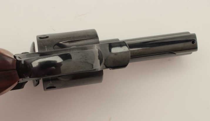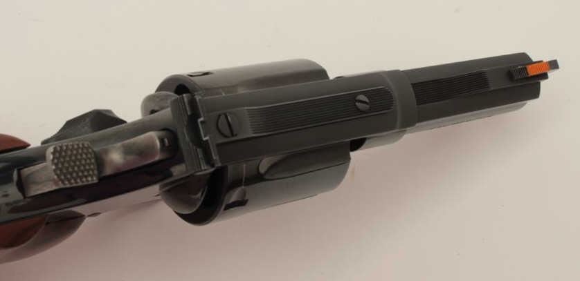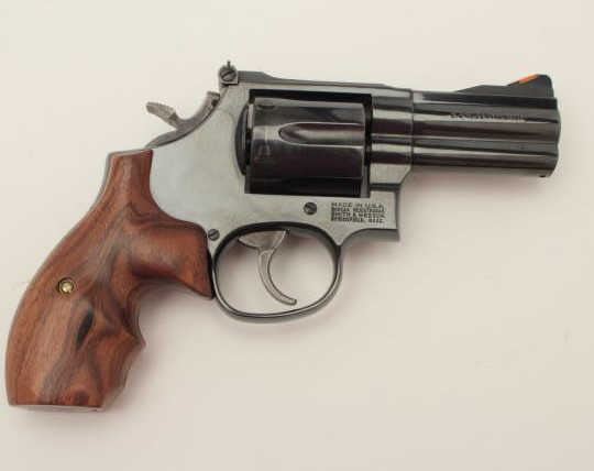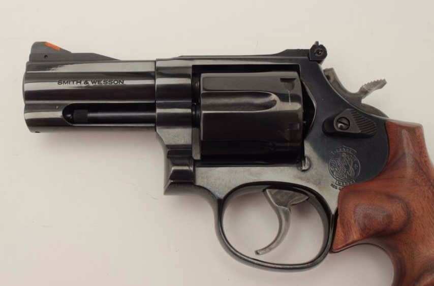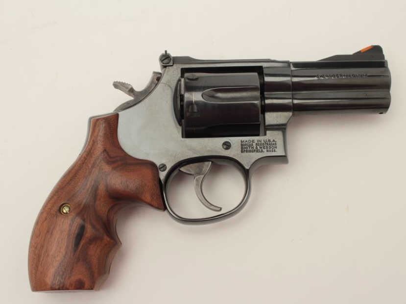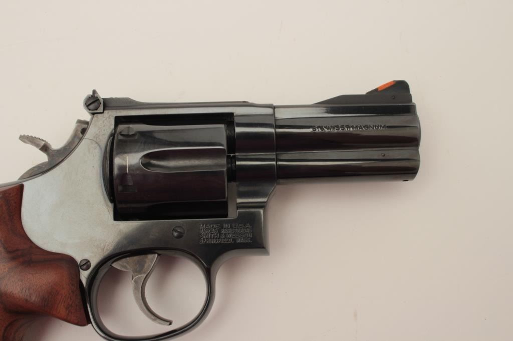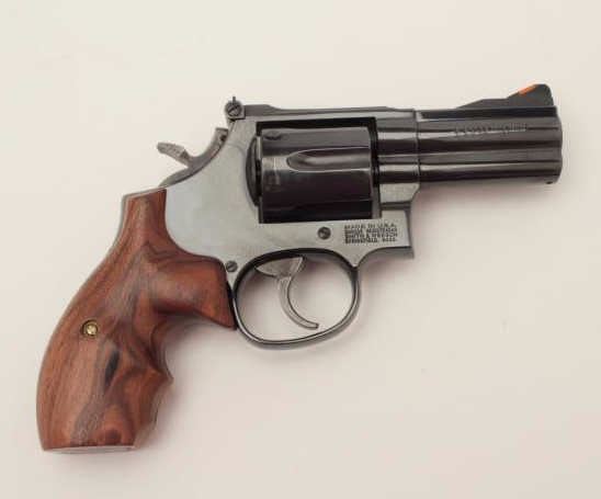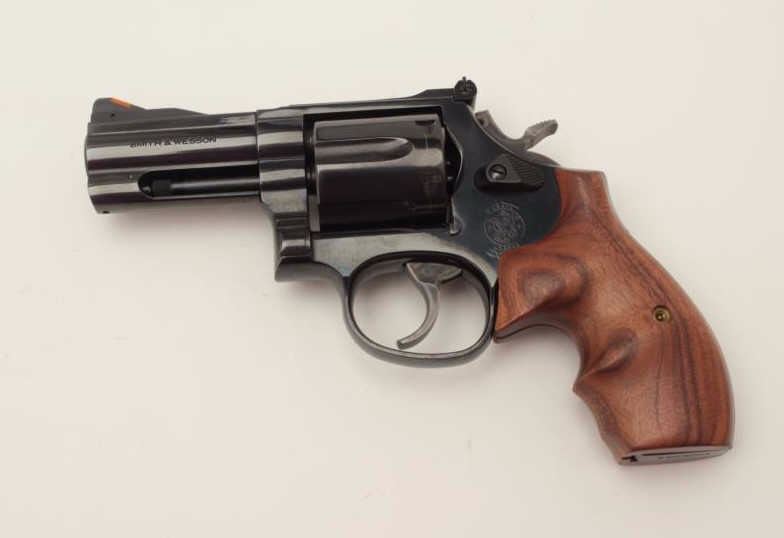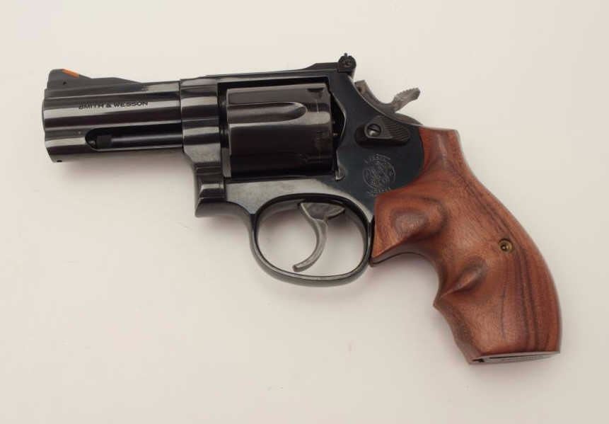 Smith & Wesson Model 586-4 limited production DA revolver, .357 Magnum caliber, 3” barrel, blued finish, custom finger groove wood grips, S/N BSA3005, in overall excellent condition; accompanied by an extra cylinderrelease housing and an extra misc. internal part. (Modern/PPT). Est.: $600-$1,200.