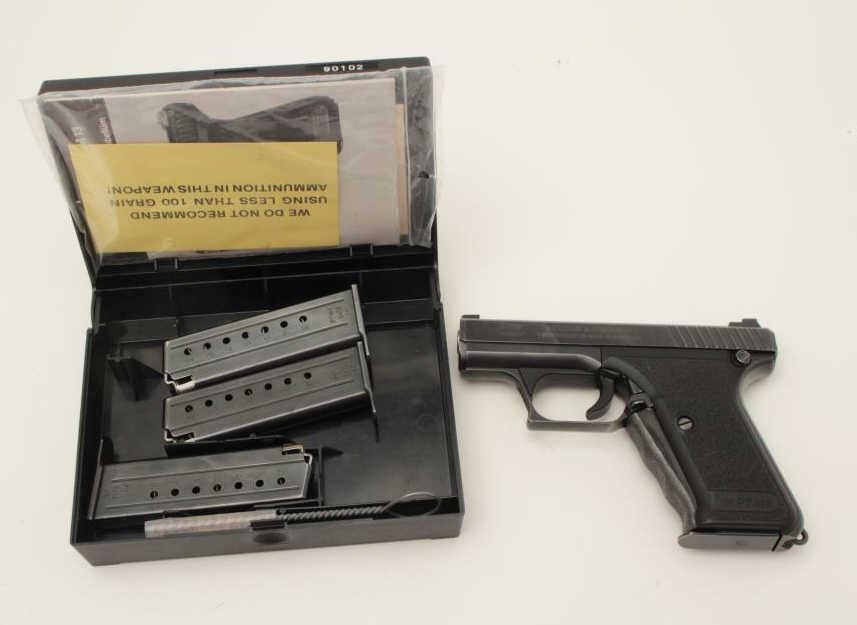 H&K Model P7 M8 squeeze cocker semi-automatic pistol, 9mm caliber, 4” barrel, blued finish, stippled black grips, S/N 90102, with 3 extra magazines, instructions and factory hard case. This gun is in overall excellentcondition showing little handling. (Modern/PPT ). Est.: $1,000-$2,000.